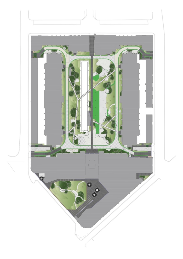 De grootste krachtlijn van het masterplan: het oorspronkelijke militaire bolwerk helemaal opengooien voor de buitenwereld. Alle gebouwen en open ruimten krijgen een eigen plek in het buurtleven. Het verharde plein wordt daarbij een buurtpark en één van de meest bruisende plekken van de stad.