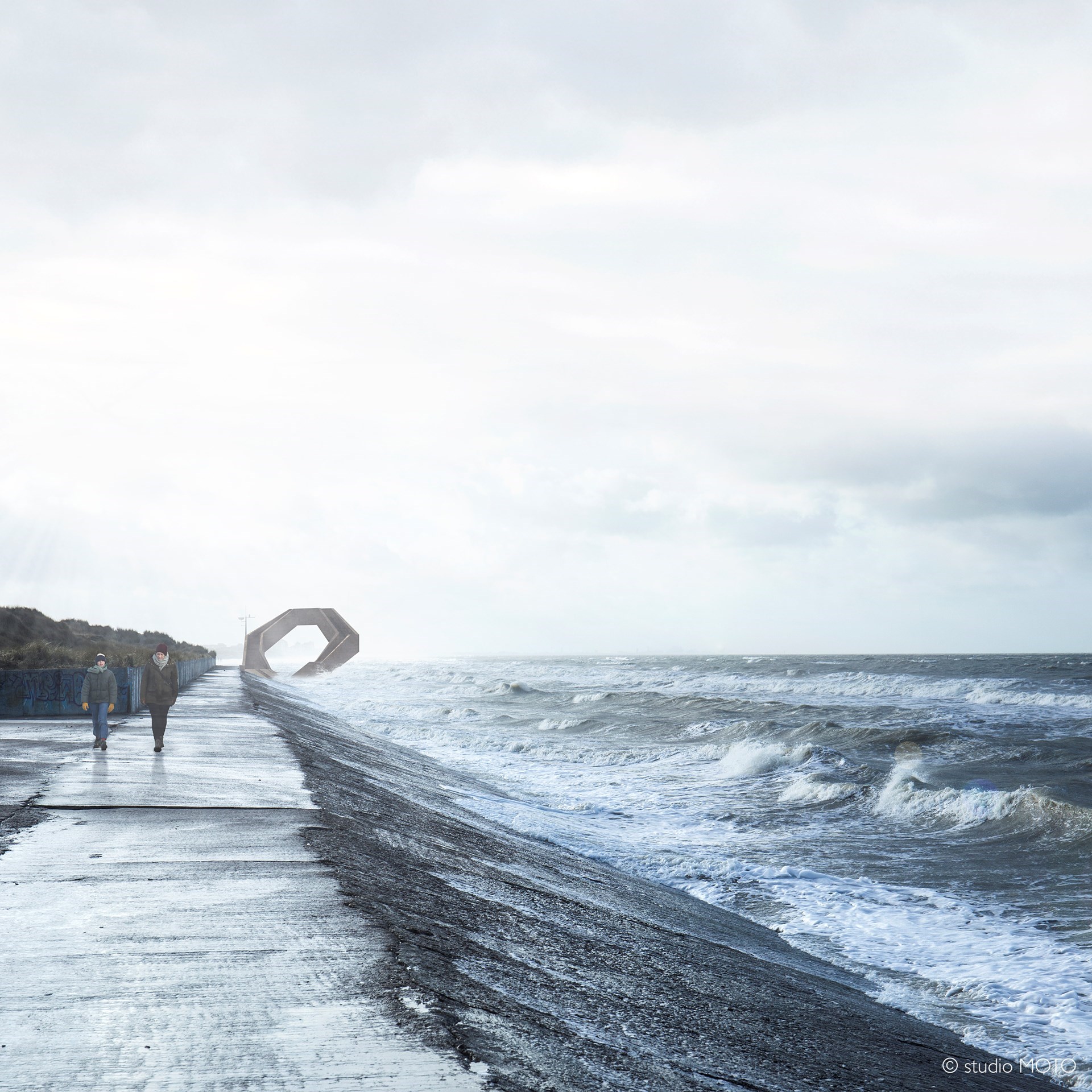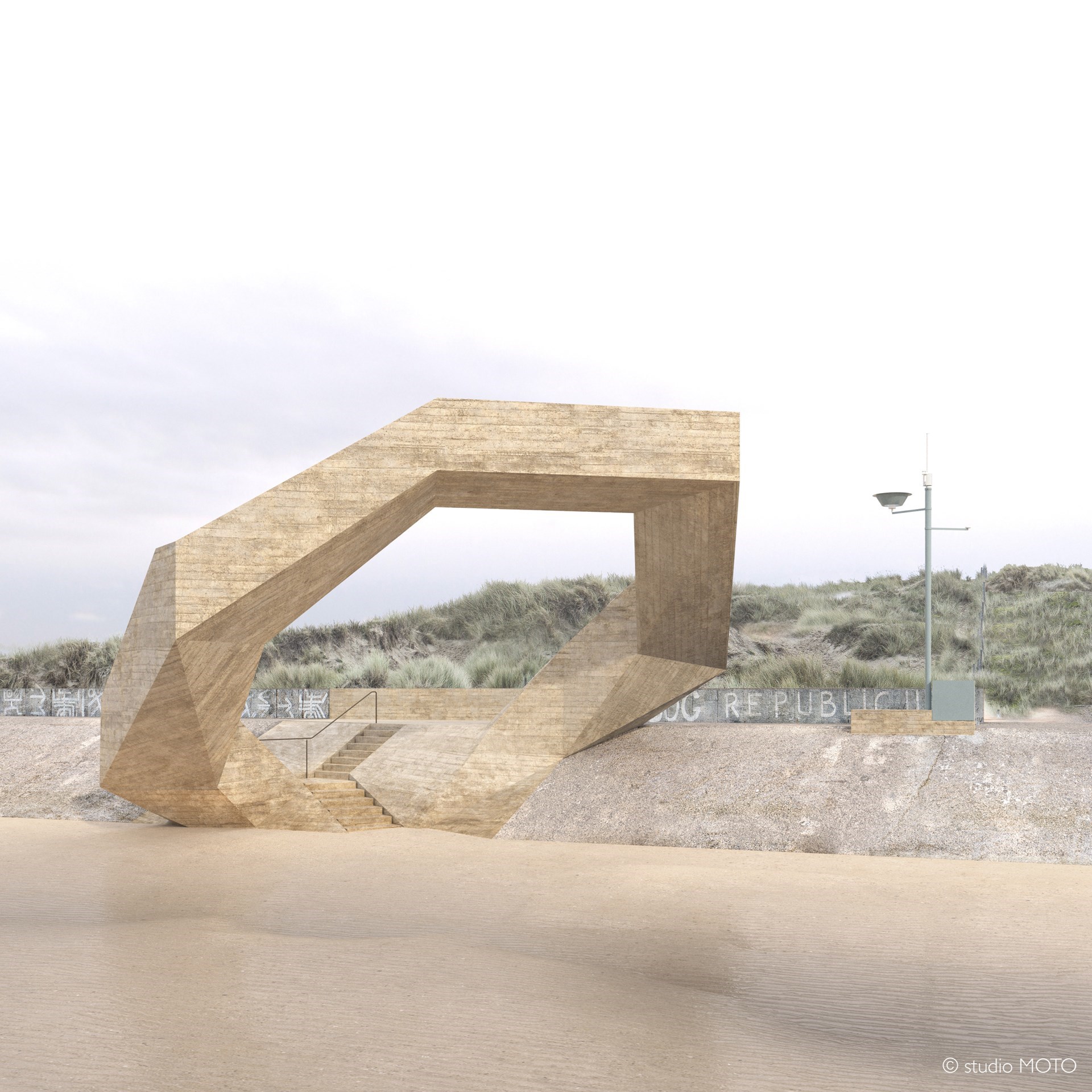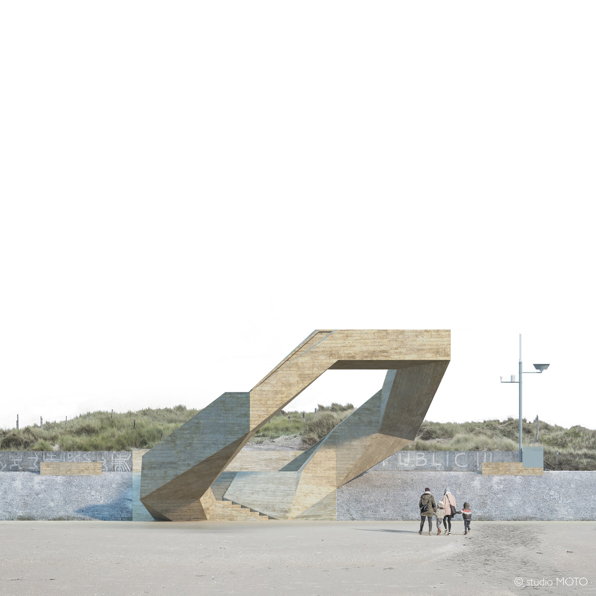 Het uitkijkpunt van studio MOTO is een geometrische, luie trap die je vanop de wandeldijk mee de hoogte inneemt. Hij laat je uittorenen boven het strand, om je dan weer verder mee naar beneden te nemen naar het lager gelegen strand of de dijk. Het verbindt symbolisch de zee met de duinen, de natuur met de kust, de bewoners met elkaar. Kortom, zowel visueel als gevoelsmatig wordt je als bezoeker in contact gebracht met alle elementen van de omgeving.