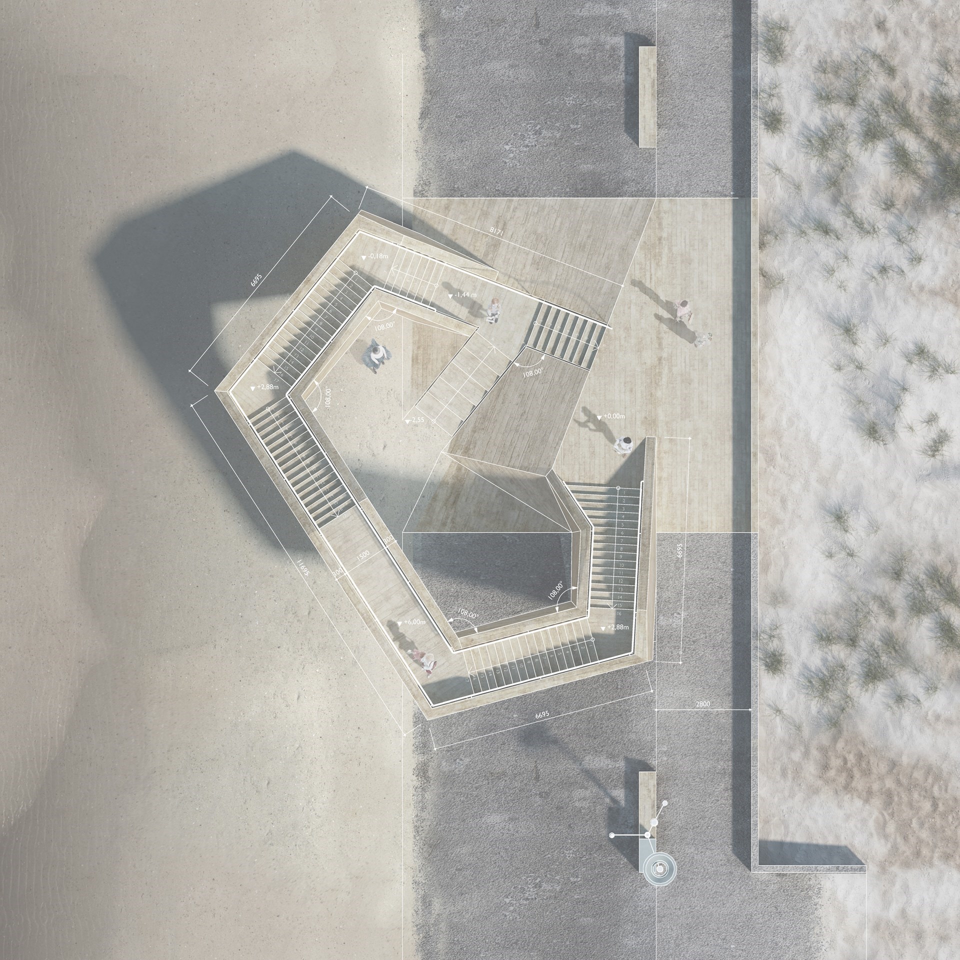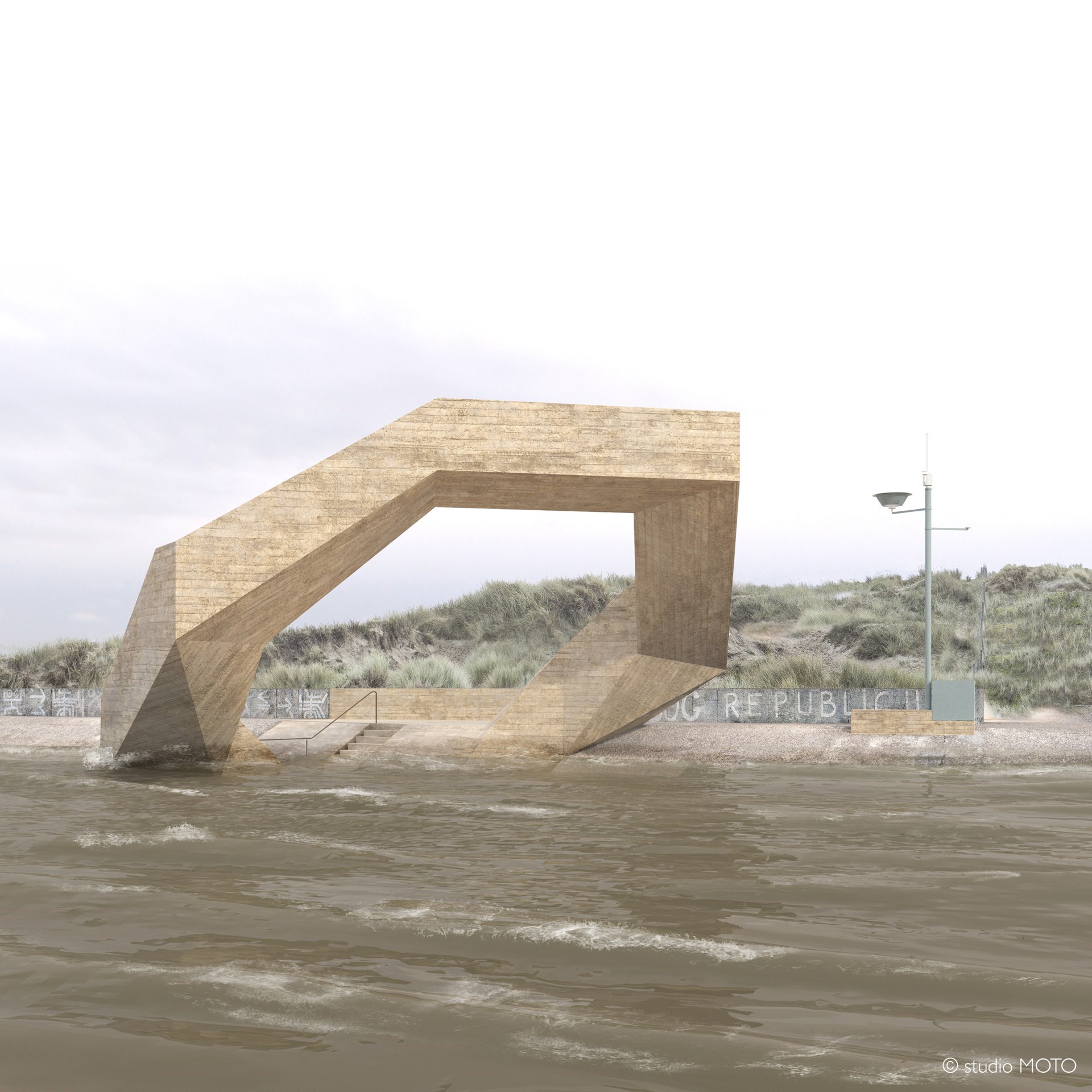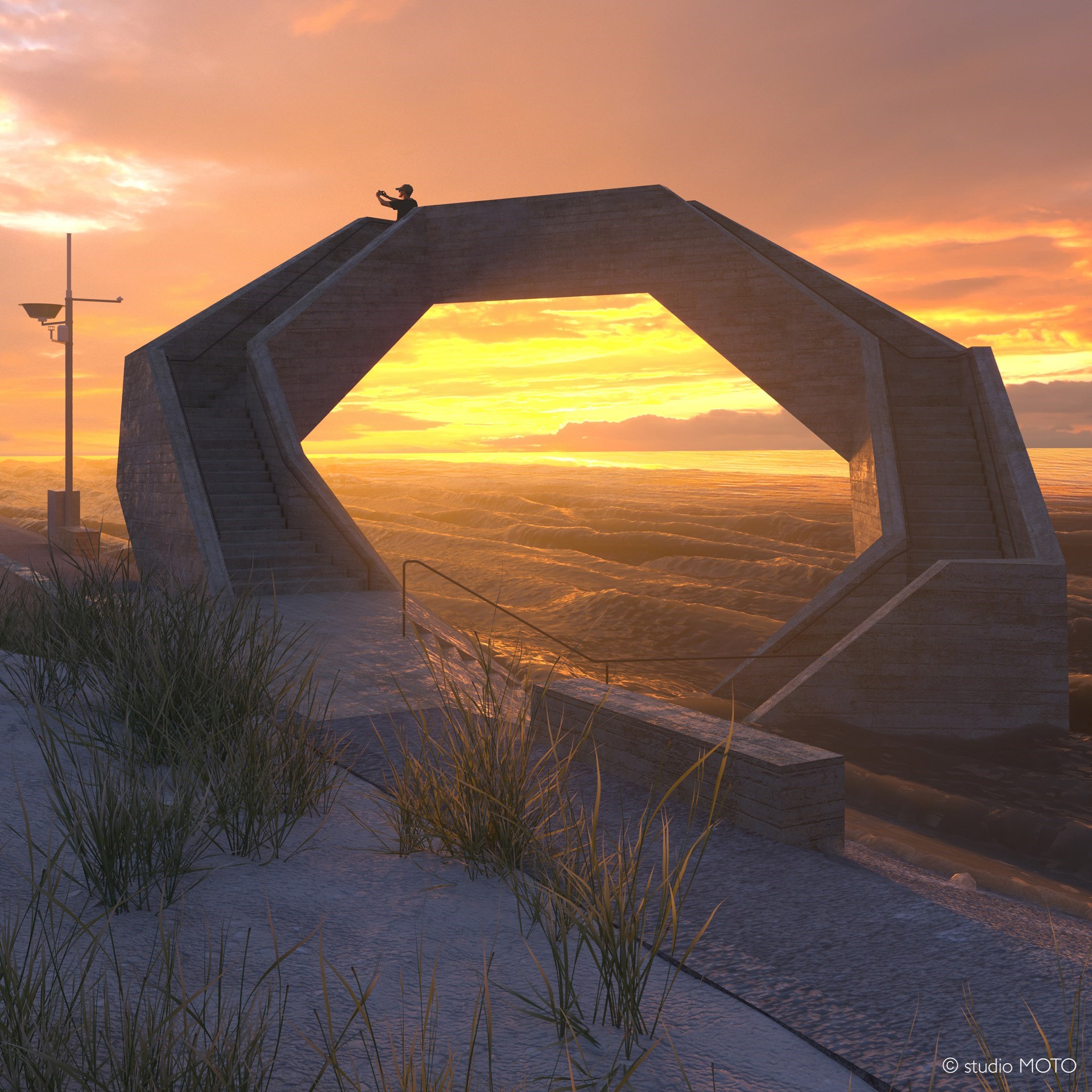 Het uitkijkpunt van studio MOTO is een geometrische, luie trap die je vanop de wandeldijk mee de hoogte inneemt. Hij laat je uittorenen boven het strand, om je dan weer verder mee naar beneden te nemen naar het lager gelegen strand of de dijk. Het verbindt symbolisch de zee met de duinen, de natuur met de kust, de bewoners met elkaar. Kortom, zowel visueel als gevoelsmatig wordt je als bezoeker in contact gebracht met alle elementen van de omgeving.