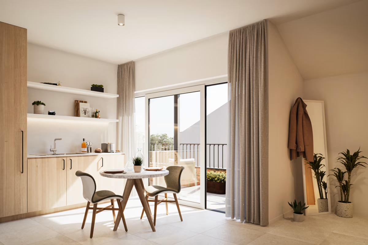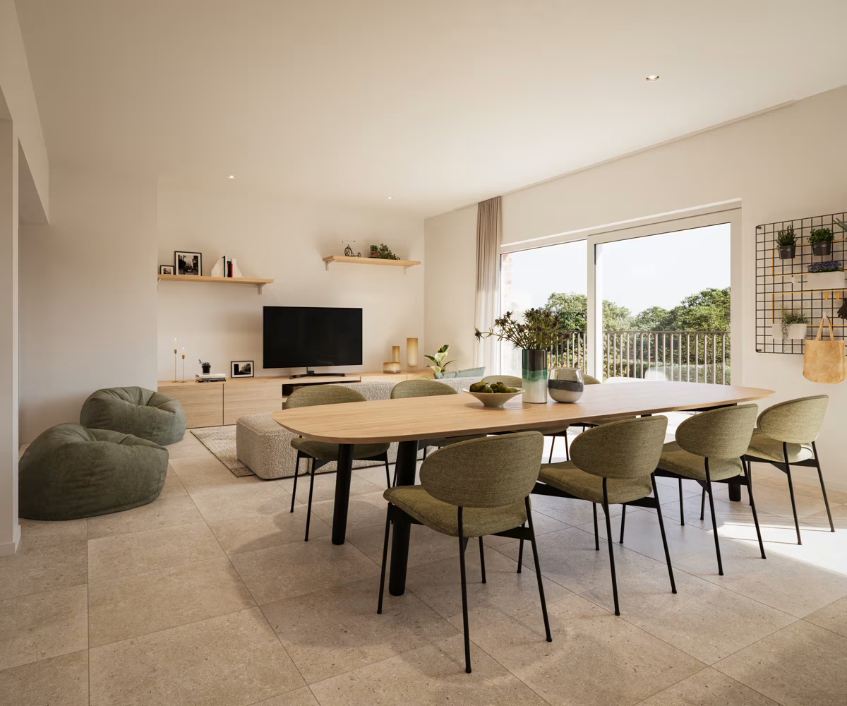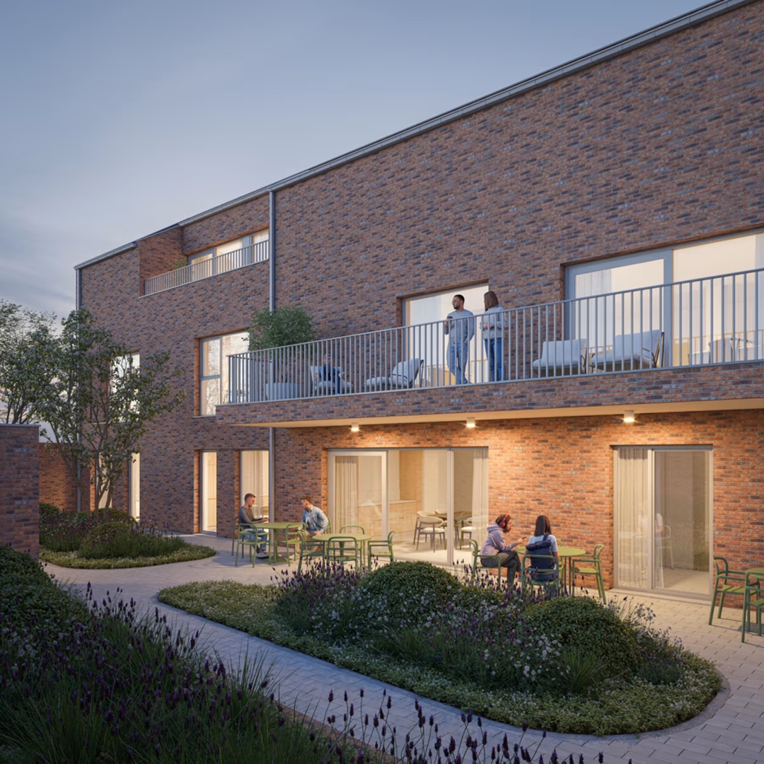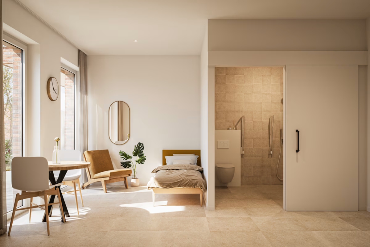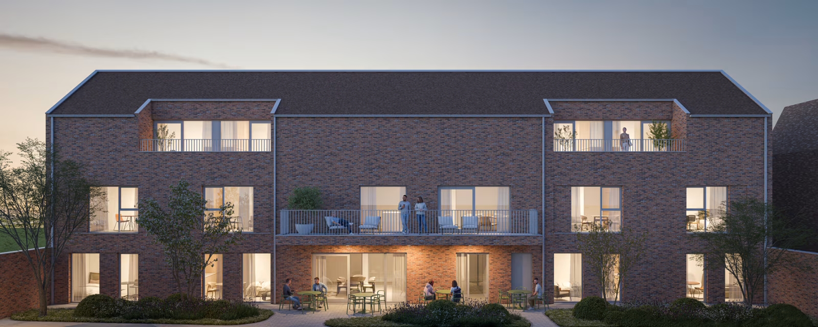 Het ontwerp van Architecten Achtergael combineert volledige privacy met ontmoetingsmogelijkheden. De zorgunits zijn zo opgevat dat bewoners zich kunnen terugtrekken in hun eigen woning, maar evengoed samen kunnen komen in de collectieve zones. De heldere plattegronden en zorgvuldige materiaalkeuze zorgen voor een warme, huiselijke sfeer die toegankelijkheid en comfort vooropstelt. Het project is financieel mogelijk dankzij een investeringsmodel: investeerders kopen de zorgwoningen, die vervolgens voor 27 jaar verhuurd worden aan VZW Ubuntu Achtkanter. Voor de investeerders betekent dit niet alleen een stabiel rendement, maar vooral een bijdrage aan een maatschappelijk waardevol initiatief.