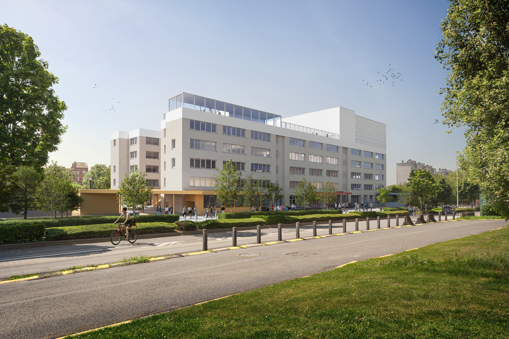 De reconversie herschrijft het DNA van de plek. Wat vroeger een gesloten kantoorgebouw was, wordt nu een open en hybride campus waar leren, creëren en sporten in elkaar overvloeien. De architectuur maakt letterlijk ruimte voor samenwerking, ontmoeting en gemeenschapsvorming, zonder de eigenheid van de verschillende gebruikers uit het oog te verliezen. Jongeren, leerkrachten, artiesten en buurtbewoners krijgen hier een plek waar zij samen de stad van morgen vormgeven — niet naast, maar mét elkaar, in een gebouw dat evenveel brug is als bestemming.