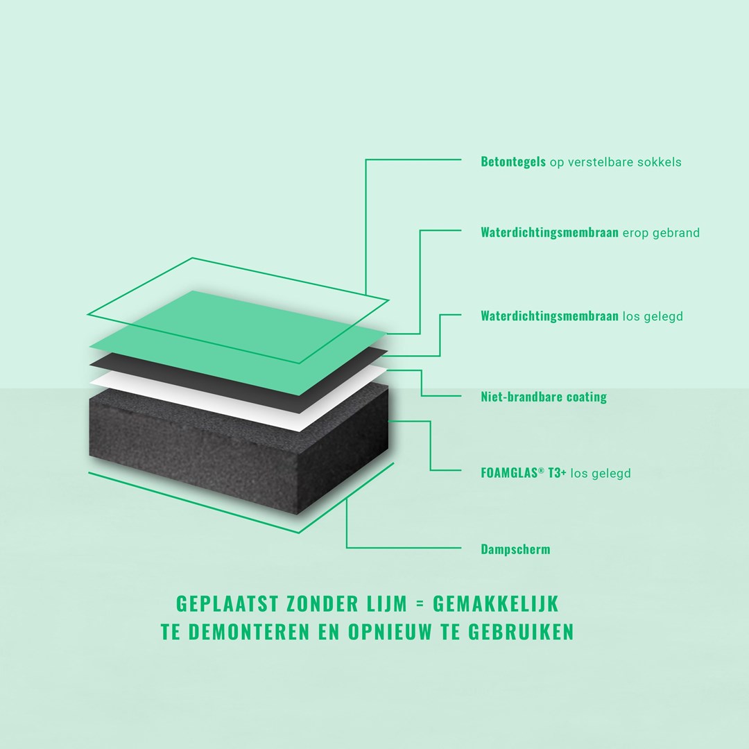 De dakstructuur is opgebouwd uit verschillende lagen, waaronder een drager van beton of hout, een dampscherm, een optionele egalisatielaag en FOAMGLAS® isolatieplaten. De tweelaagse bitumineuze waterdichting zorgt voor optimale bescherming, terwijl de ballast het geheel stabiliseert.