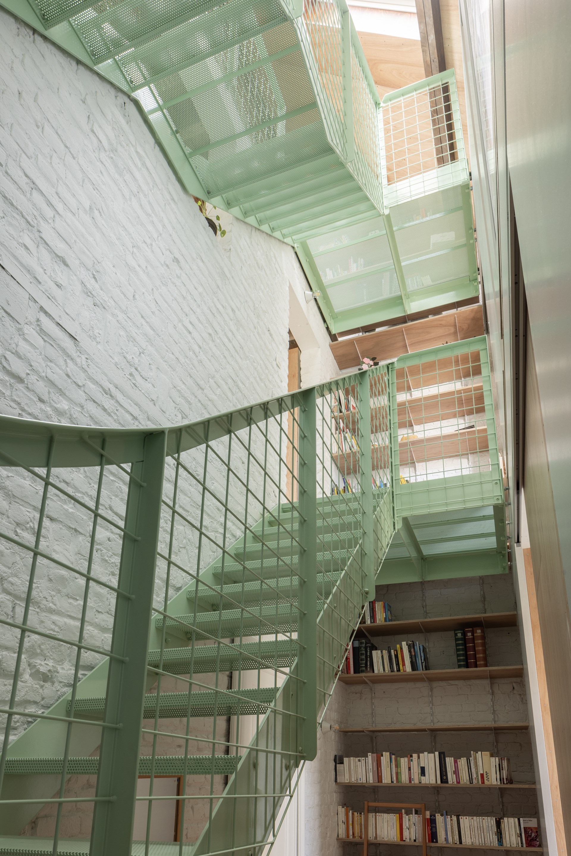 In de woning huisvest een gezin van illustratoren met hun dochter. De ruimtes waren versnipperd over de woning en hadden een slechte kwaliteit. Via het slaapgedeelte betreed je de woning. Als je de trap oploopt, bereik je de keuken en polyvalente ruimtes die je toegang bezorgen tot de woonkamer onder het dak. De bibliotheek begeleidt de verticale circulatie door de verschillende ruimtes op de drie verdiepingen.