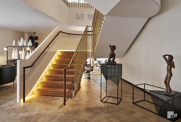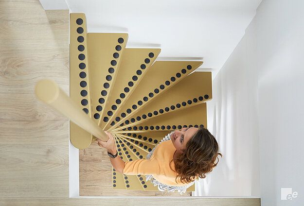 Toen EeStairs zijn trap van 1m2 ontwierp en perfectioneerde, werd ervoor gezorgd dat de stalen paal en de radiale treden in de fabriek in elke RAL-kleur kon worden afgewerkt, ook in een gouden poedercoating. De ruimtebesparende trappen verlichten probleemloos krappe hoeken en leiden stijlvol naar de bovenliggende verdieping.