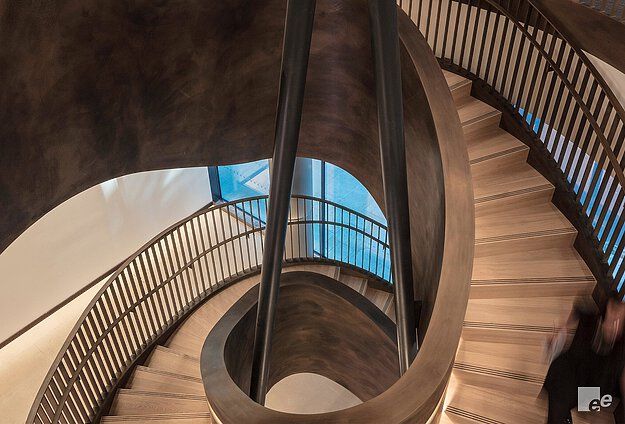 In het Londense advocatenkantoor van Bird & Bird plaatste EeStairs een opvallende trap die het middelpunt vormt van de ontvangstruimte. De goudbronzen afwerking van de leuning en balusters geeft de elliptische trap een warme visuele en voelbare gravitas. Dit komt de architectonische kwaliteit van de trap, ontworpen door MCM Architecture, ten goede.