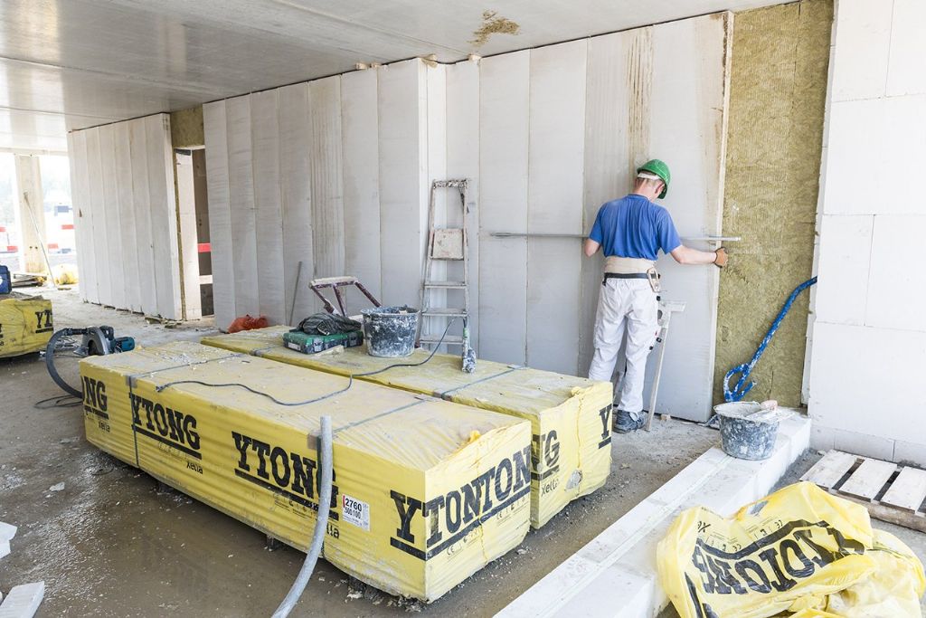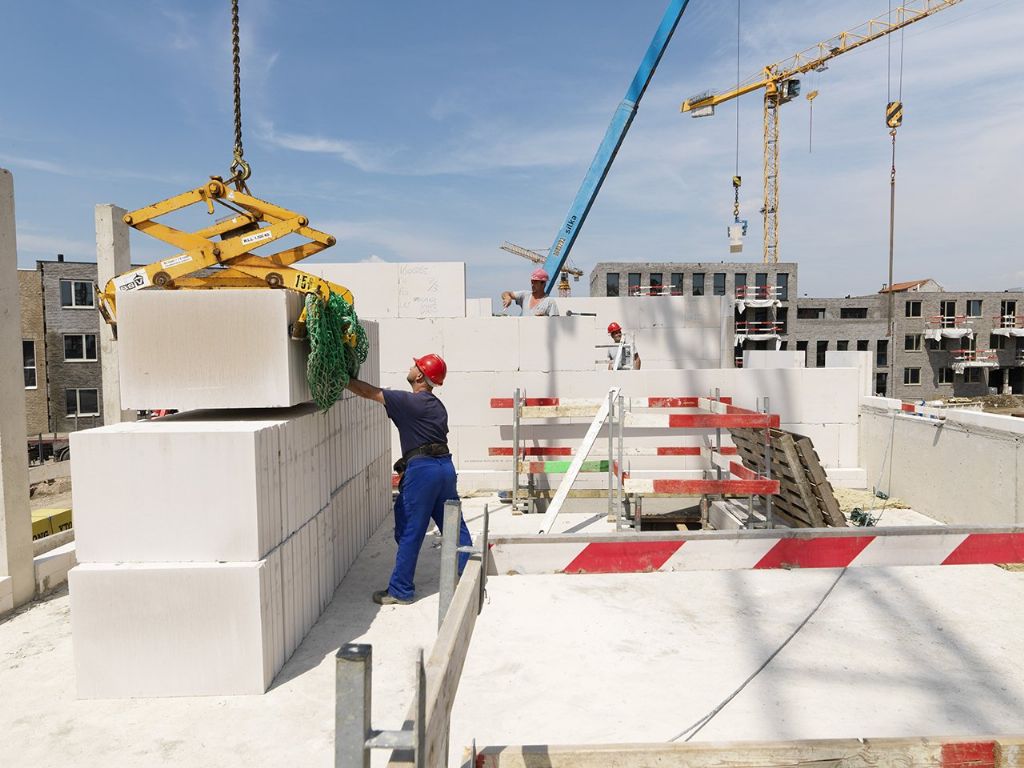 Nog meer efficiëntie wordt mogelijk gemaakt door het toepassen van ‘verdiepinghoge binnenwanden’ (VHP) van Ytong. Deze panelen hebben een standaardbreedte van 50 cm en worden aangeleverd in pakken van 7 stuks. Deuropeningen worden op de werf uitgezaagd. Tim Jacobs: “De keuze voor Ytong VHP werd tijdens de uitvoering gemaakt. Het werkt supersnel en zuiver. Er is slechts 4 cm speling nodig tussen de vloerplaten om de panelen te kunnen oprichten”. In fase 1 & 2 van ‘Groen Zuid’ worden in totaal 22.500 m² Ytong VHP geplaatst.
