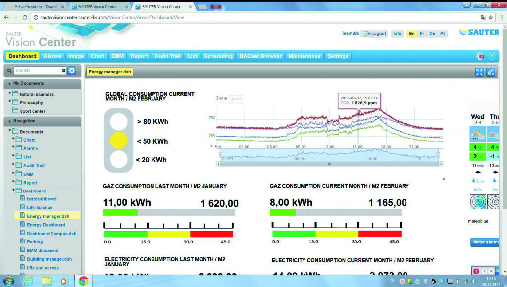 Sauter Vision Center werkt intuïtief: “Klanten kunnen zelf eenvoudig rapporten of vergelijkingen opmaken. In het dashboard krijgen ze meteen een overzicht van de belangrijkste gegevens te zien. Rekening houdend met de functies en de toegangsrechten kan het dashboard bovendien gepersonaliseerd worden.” Ook het gericht plannen van onderhoud op basis van zelf ingestelde parameters behoort tot de mogelijkheden. En Sauter Controls geeft trainingen aan klanten om het programma eenvoudig naar hun hand te zetten en het gebruik te optimaliseren.