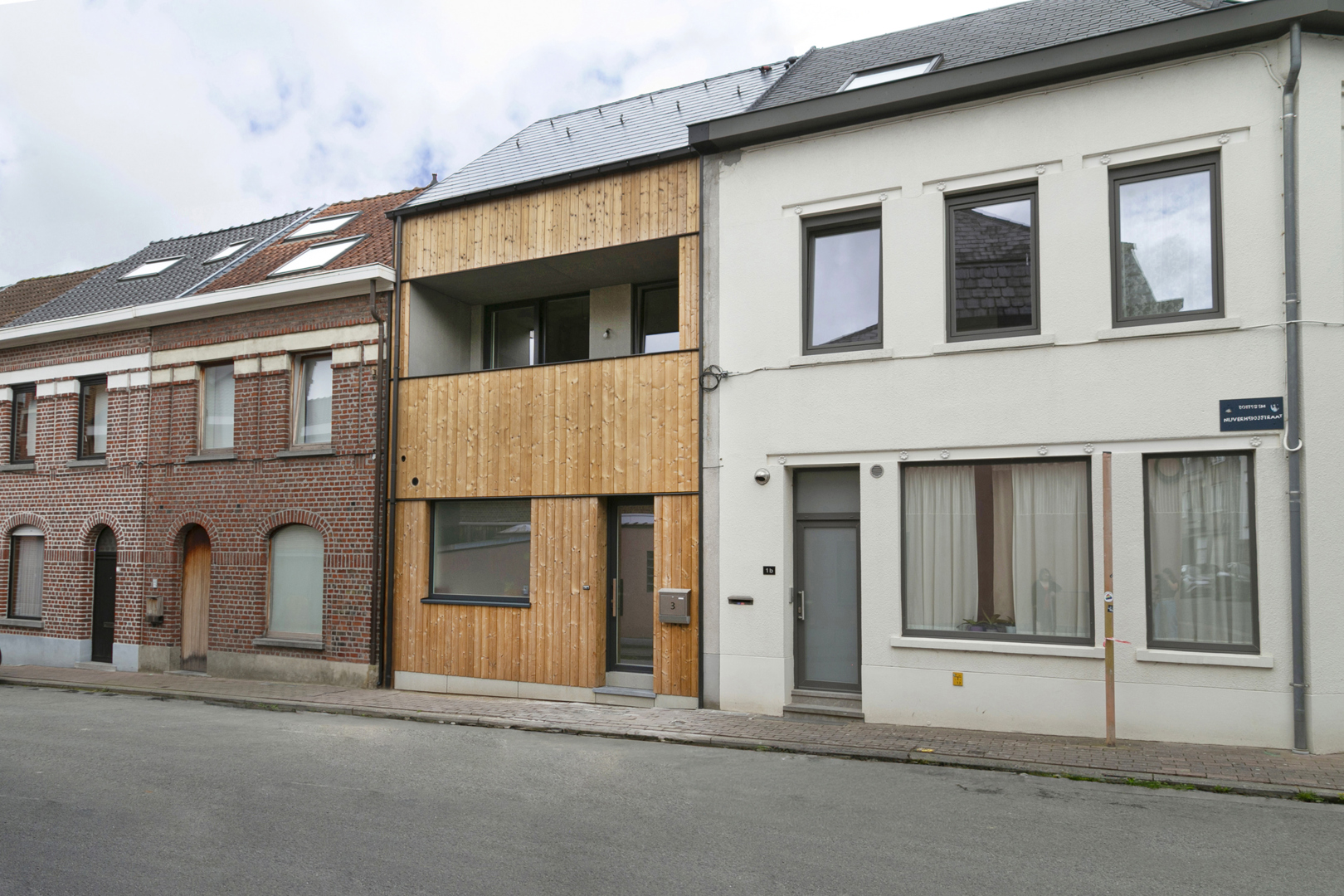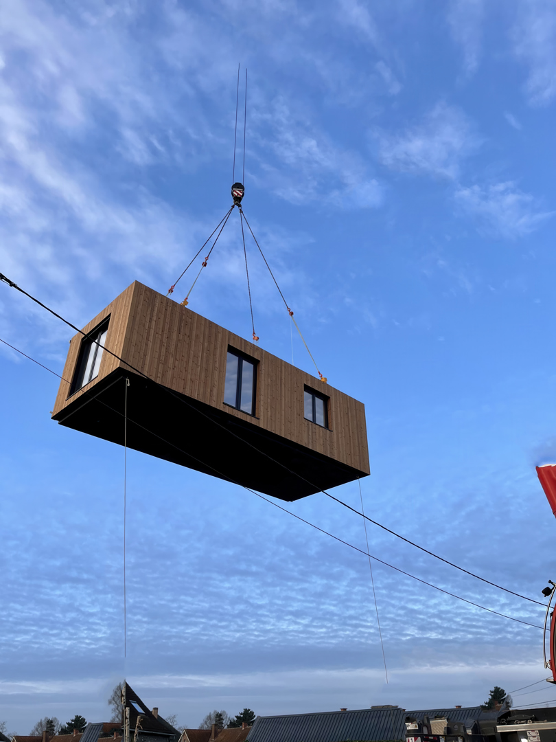 De Mobble (samentrekking van het Engelse ‘mobile’ en ‘building block’; ‘mobiele bouwsteen’) zweeft tot wel tien meter boven de grond, voordat de kraan hem in een van de typische smalle open ruimtes tussen Belgische rijhuizen plaatst. Dat is wat er gebeurde bij een project in Antwerpen, waar eerst de eerste verdieping werd geplaatst en daarna de tweede. De montage duurt slechts een paar uur, het gebouw staat er nog dezelfde dag. Een groot voordeel, want zo heeft het weer geen invloed op de levering of de laatste bouwfase – de landing. De kleine huizen worden uiterst efficiënt gebouwd, doordat het volledige productieproces plaatsvindt in het eigen atelier in Eeklo. Badkamer, keuken, ramen, tegels, vloeren – zelfs de leidingen worden vooraf geïnstalleerd. Na plaatsing ontbreekt meestal enkel nog de trap. De gebruikte materialen zijn duurzaam en ecologisch. De basis is steeds hout, en voor de isolatie wordt onder andere cellulose gebruikt. De bouwmaterialen zijn ontmantelbaar, gemakkelijk te scheiden en opnieuw te gebruiken. Moderne technologieën zoals warmtepompen en zonnepanelen garanderen een duurzaam energiebeheer – en een aangenaam binnenklimaat. Na slechts vier maanden planning en productie is het gebouw klaar voor transport naar de bouwplaats.