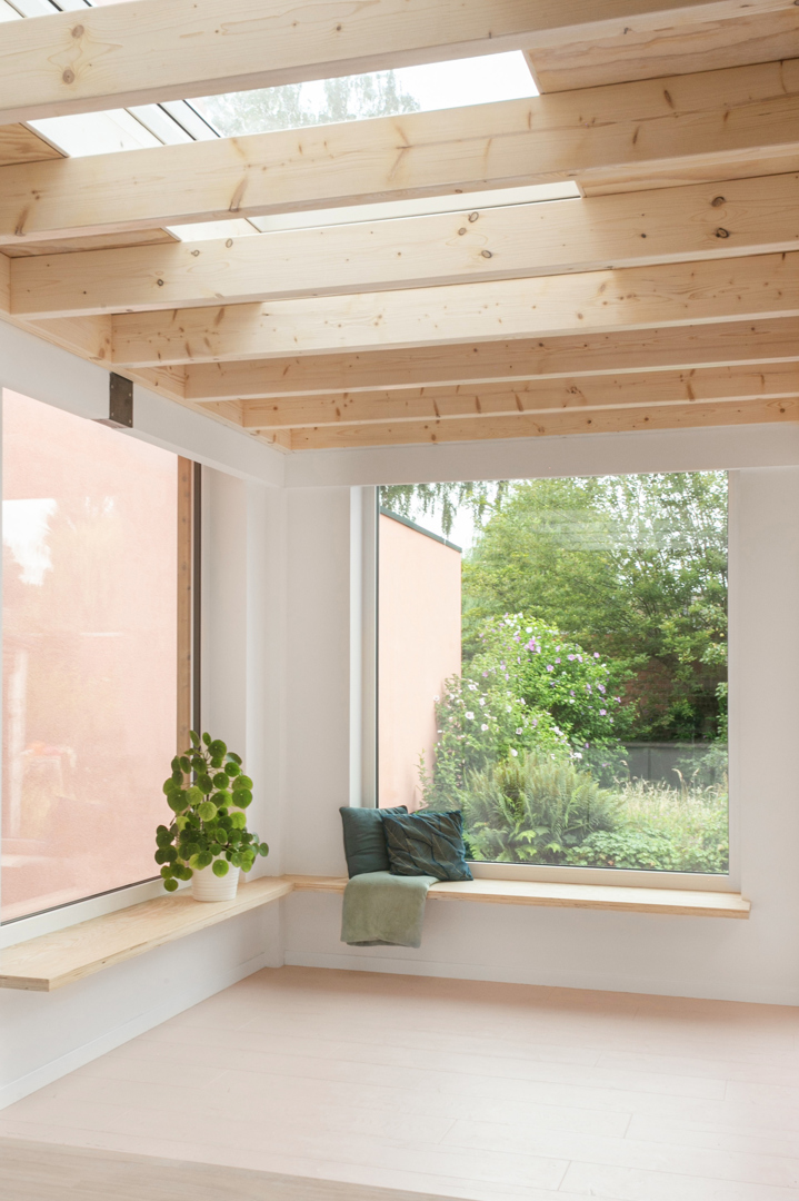 Omdat Mobble net als Finstral modulair denkt, kozen de Belgen voor een samenwerking met het Zuid-Tiroolse familiebedrijf. En doordat Finstral het volledige proces in eigen hand heeft – van de ontwikkeling en extrusie van profielen tot de productie van isolatieglas en het poedercoaten van aluminium – kan de raamfabrikant systemen aanbieden waarin vrijwel alles met alles te combineren is. Het raamwerk voor de Mobbles wordt langs buiten uitgevoerd in aluminium, in ongeveer 250 verschillende kleuren, en langs binnen in onderhoudsvriendelijke kunststof, beschikbaar in zeven kleuren. Beide materialen zijn bovendien verkrijgbaar in diverse houtdecors.