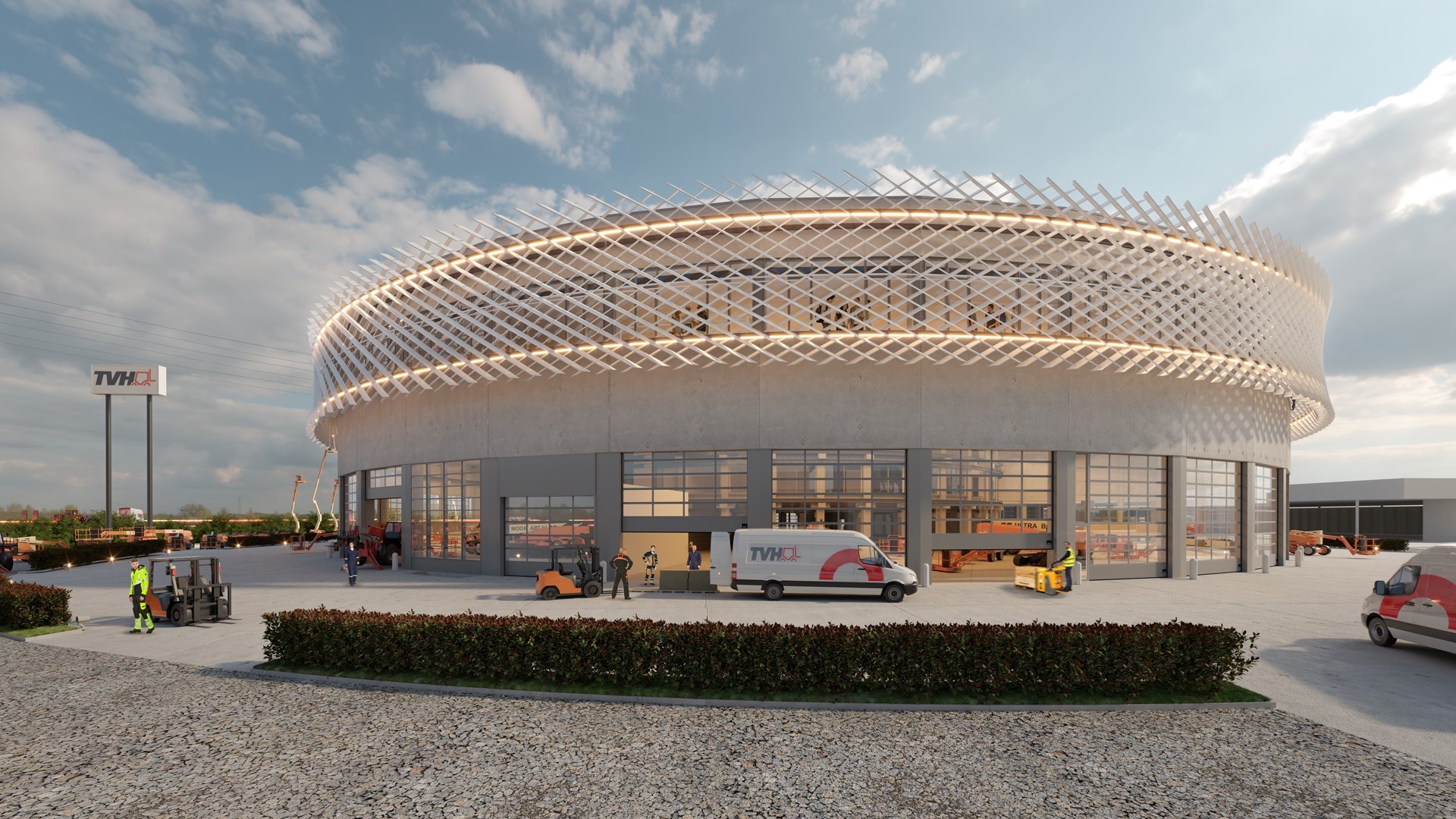 Het bedrijf TVH Equipment, gespecialiseerd in de verkoop, verhuur en onderhoud van machines, vereiste een praktisch ontwerp voor hun nieuwe hoofdkantoor. Met in totaal 40 werkplaatsen en kantoren voor meer dan 200 personen, moest het gebouw functioneel en efficiënt zijn. De ronde vorm van het gebouw ontstond uit de noodzaak om de werkplaatsen rondom het centrale magazijn te schikken, om zo lange loopafstanden te vermijden.