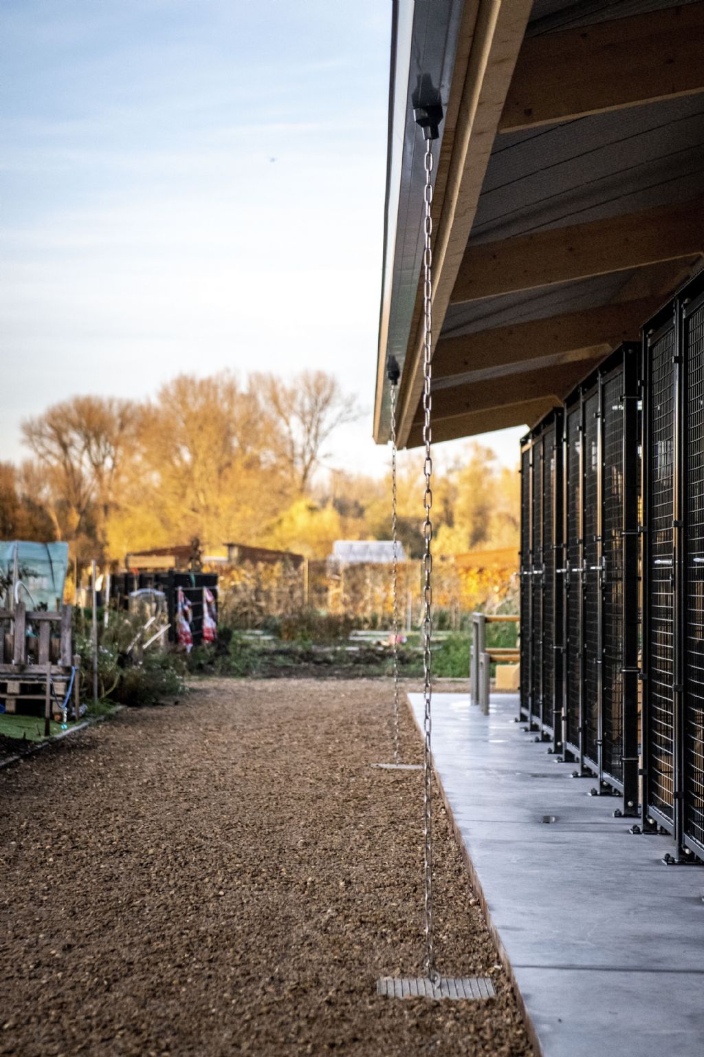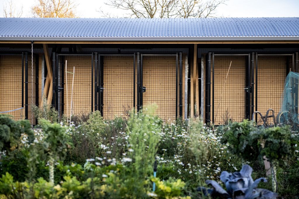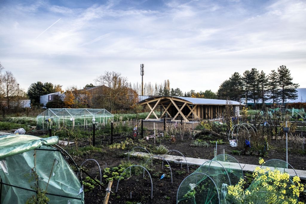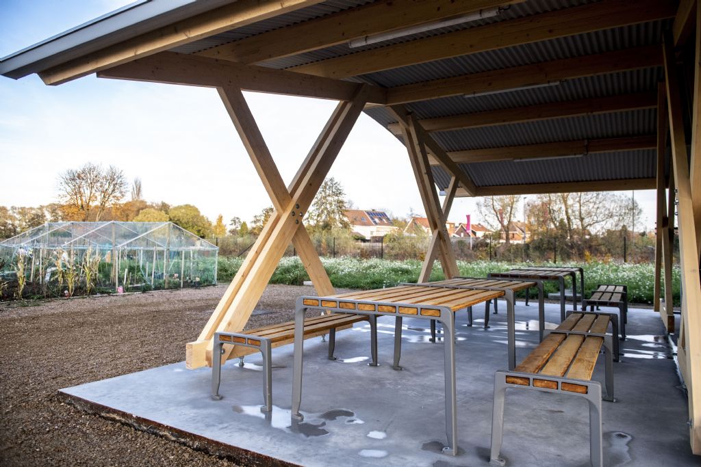 De dakconstructie is een afgeleide van de functie die het vervult. Het gebogen dak geeft een beschut en beschermend gevoel, terwijl de gekruiste spanten een sterk en dynamisch gevoel geven. Het gebouw bestaat, de bergingen voor de individuele tuintjes en de picknicktafels niet meegerekend, uit twee kamers.