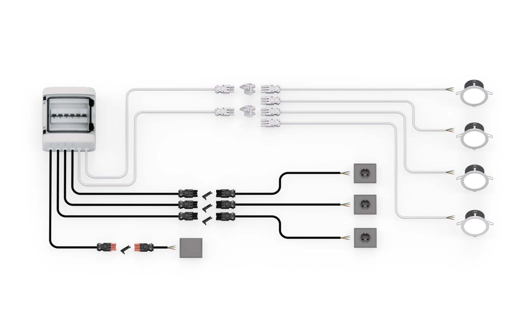 Elektrische componenten zoals kasten, lampen, schakelaars en stopcontacten zijn volledig stekerbaar, waardoor installatie op de bouwplaats neerkomt op eenvoudige plug & play acties. Dit systeem vereist slechts supervisie van iemand met elektrische kennis, waardoor het gebrek aan geschoolde arbeidskrachten minder een probleem vormt.