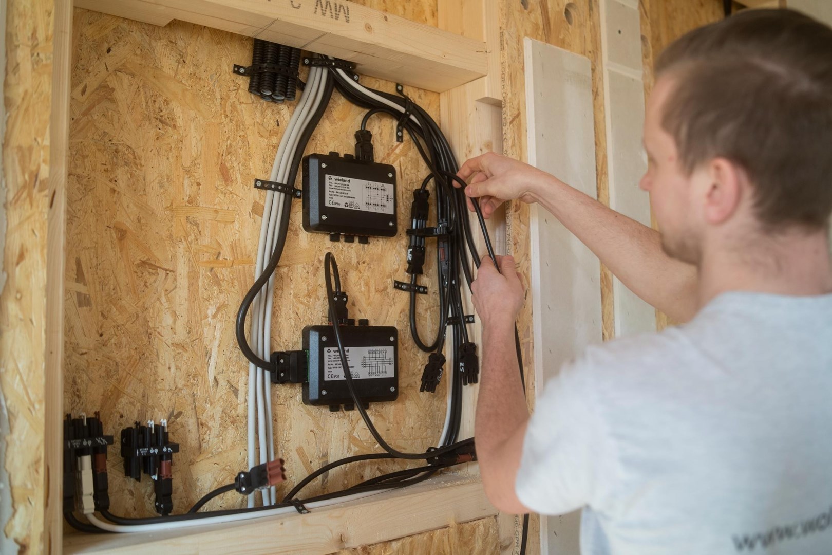 Wieland’s prefabsystemen verschuiven de complexe elektrische installatie van de bouwplaats naar de prefabfabriek. Hierdoor worden houten of stalen bouwmodules vooraf geïntegreerd met elektrotechnische infrastructuur en kant-en-klaar afgeleverd op locatie. Dit verhoogt het integratieniveau en vermindert inspanning en foutmarges tijdens de installatie, wat leidt tot versnelde bouwprocessen, lagere kosten en optimaal gebruik van middelen.