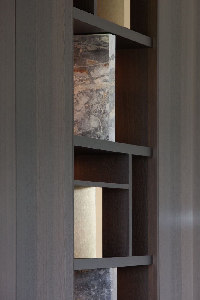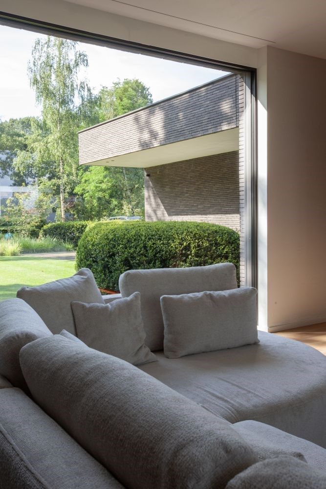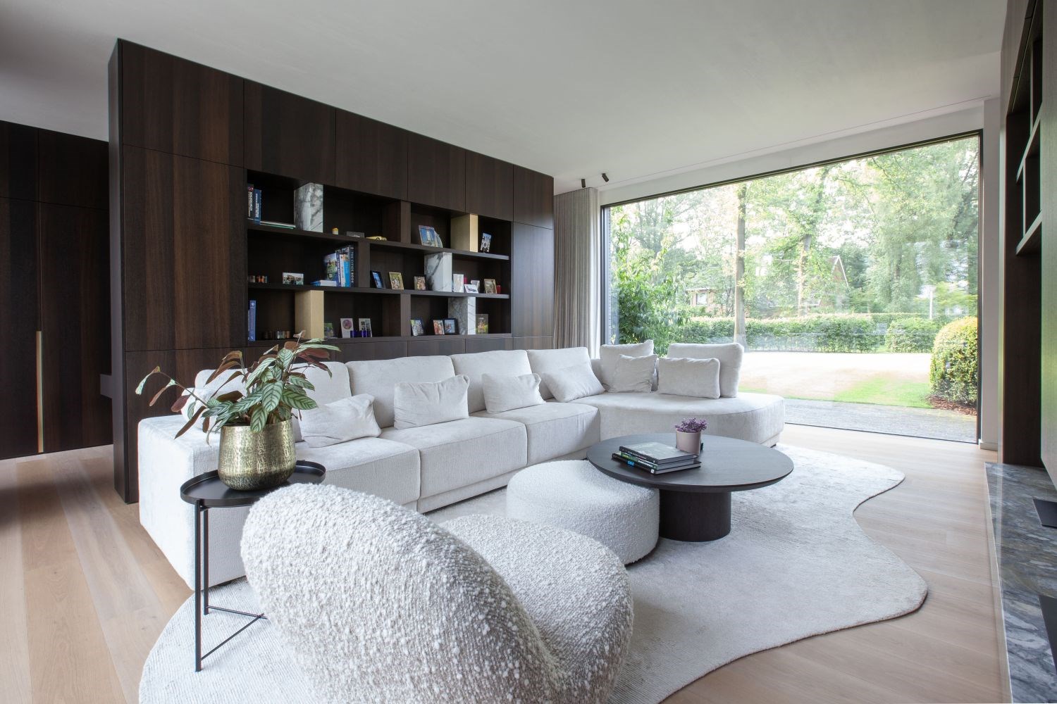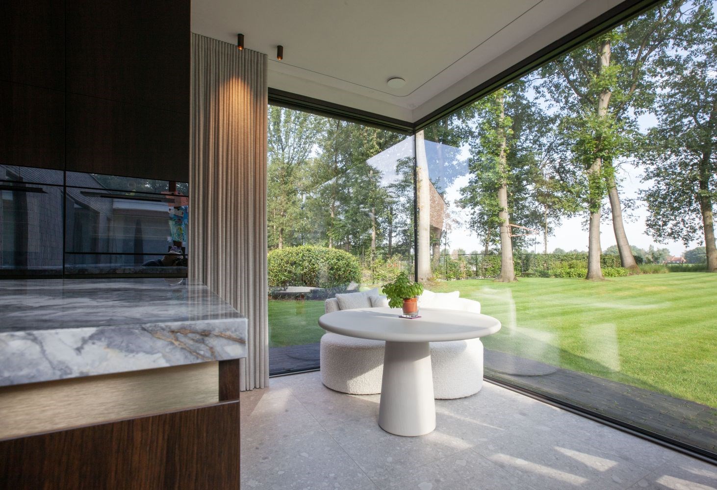 Het materiaalgebruik speelt een sleutelrol in de sfeer van deze woning. De overvloed aan notelaarhout zorgt voor een warme, natuurlijke uitstraling die harmonieus aansluit bij het invallende daglicht. Messing en natuursteen zijn subtiele, maar consequente accenten in het interieur en worden doorgetrokken in details zoals verlichtingsarmaturen, kraanwerk en handgrepen. Deze materialen worden niet enkel esthetisch, maar ook functioneel ingezet, zoals te zien is in de slimme inrichting van het keukeneiland en de kasten.