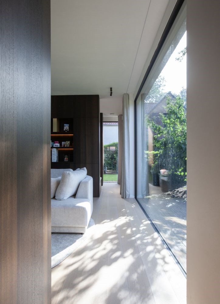Achter het tv- en haardmeubel ligt een functionele kern die de inkomhal, vestiaire, toilet en trap herbergt. De eetruimte en keuken flankeren deze kern en zijn slim gepositioneerd om een dynamisch samenspel van loop- en zichtlijnen te creëren. De uitkraging van de keuken ten opzichte van het hoofdvolume zorgt ervoor dat de ruimtes haaks op elkaar staan, wat een helder kruispunt vormt in de woning. Deze luchtige indeling laat bewoners langs verschillende leefwerelden bewegen zonder de functies zelf te doorkruisen, waardoor een gevoel van rust en overzicht ontstaat.