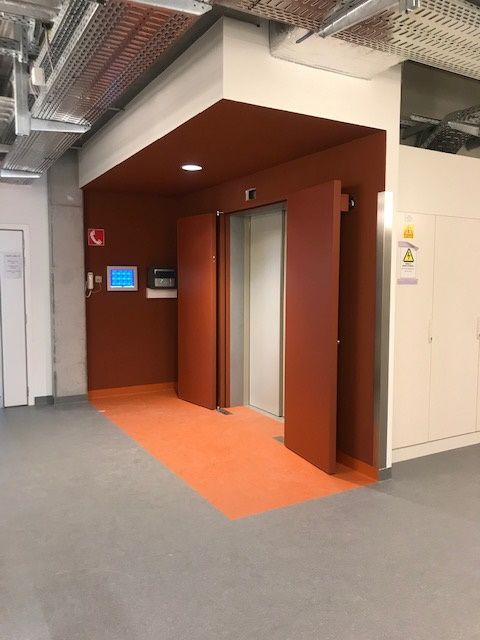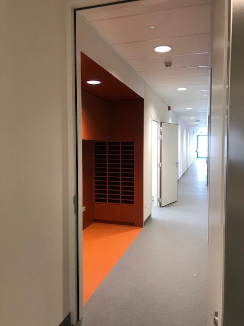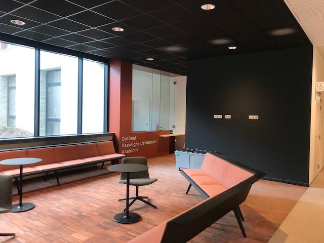 Toch fleuren afgeschuinde, koperbruine aluminiumpanelen rond de ramen de sobere gevels op. Die kleur komt ook regelmatig terug in het interieur van het gebouw. De ontvangstbalie, lift en kussens op de zetels in de wachtzaal zijn maar enkele elementen die het koperen kleurenpalet representeren. Ook de vormgeving van de passerelle tussen het oude en het nieuwe gebouw is iets meer uitgesproken. Die lagere en smallere verbindingsvleugel met kantoren en vergaderzalen bestaat zo goed als volledig uit glas.