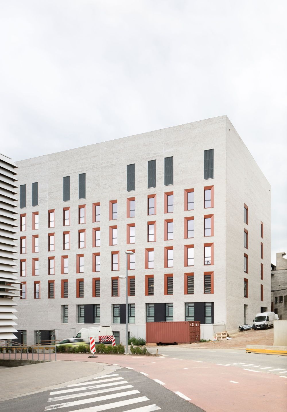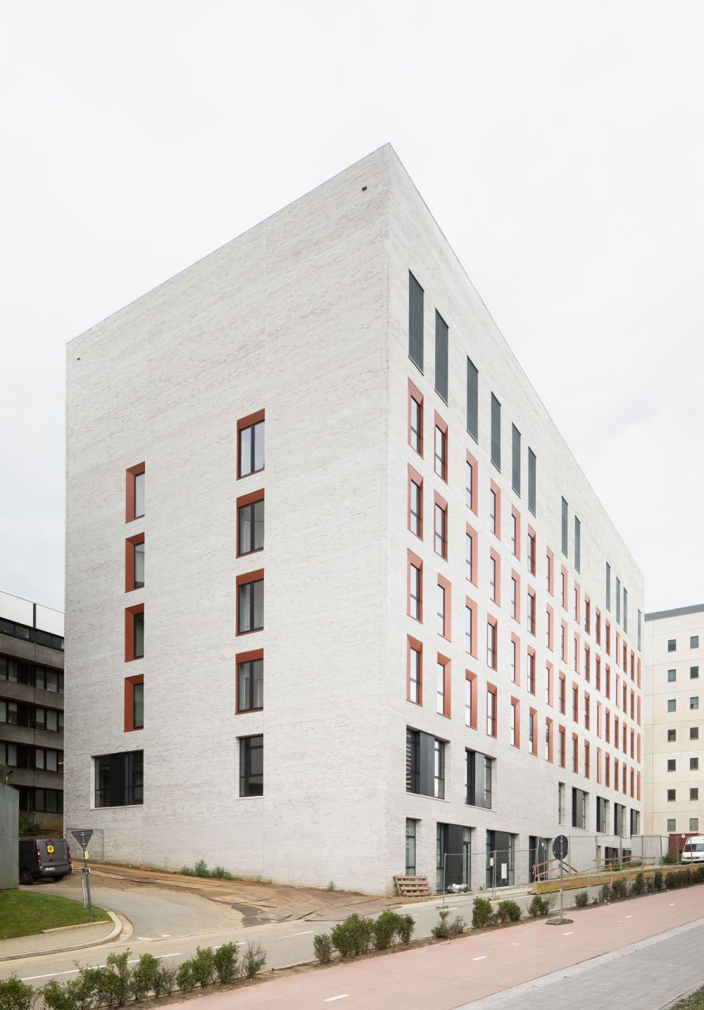 Ook het exterieur volgt die modulaire opbouw van de laboruimtes. De bijna identieke raampartijen zijn geplaatst met de situering van de labotoestellen en een maximale lichtinval in het achterhoofd. De sobere, lichtgrijze bakstenen gevels krijgen zo dus een strak ritme. “Het gebouw is ingepland op een toenmalige restruimte langs de ringweg aan de noordzijde van Campus Gasthuisberg, op een hellend perceel”, zegt Marie Van den Driessche van Abscis Architecten. “Het wordt omgeven door een mix van oudere en recentere onderzoeksgebouwen, waardoor er werd geopteerd om het nieuwe gebouw geen uitgesproken eigen identiteit te geven.”