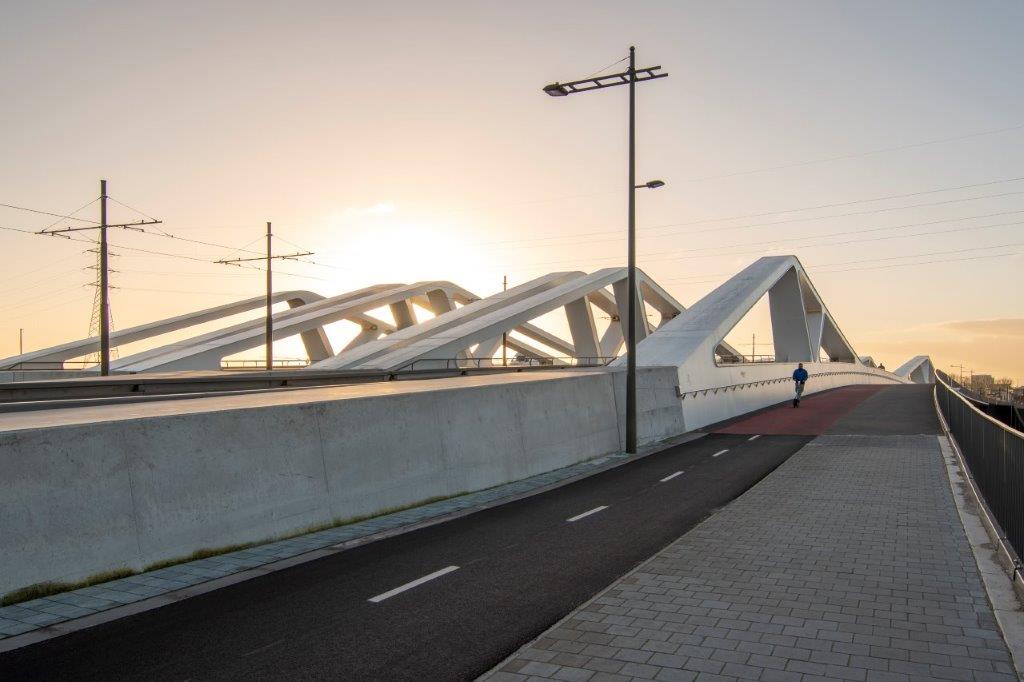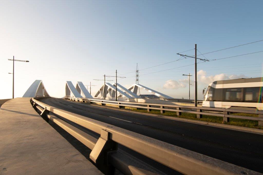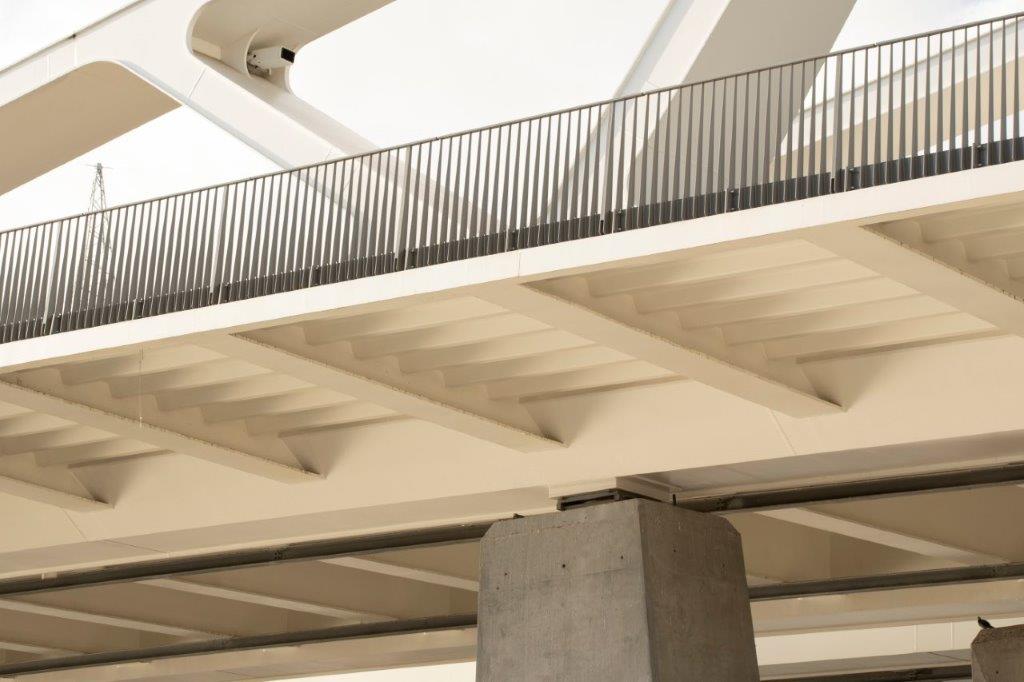 “De bruggen zijn opgetrokken in S460- en S355-staal. In de smalste wegbrug is circa 2500 ton staal verwerkt, in de grootste wegbrug 2800 ton en in de trambrug 2000 ton. Ze bestaan uit twee hoofdliggers die met elkaar verbonden zijn door middel van dwarsdragers. De bovenbouw is opgebouwd uit trekkers en kolommen. De zwakke weggebruikers bewegen zich aan weerszijden over een uitkragende structuur die aan de hoofdliggers is bevestigd en die is uitgerust met een wegdek in PU-hars. De corrosiebescherming bestaat uit metallisatie en een vierlaags verfsysteem”, aldus Evelien Pieters, projectingenieur bij Aelterman.