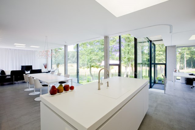De volledig in de breedte beglaasde achtergevel van het woongedeelte loopt hoger door dan het plafond en lager dan de vloer. Dit verruimt de blik zowel naar boven als naar beneden. Buiten en binnen gaan zo volwaardig in elkaar op. De staat van het terrein is nauwkeurig opgemeten en het ontwerp ingebed in de bestaande morfologie.