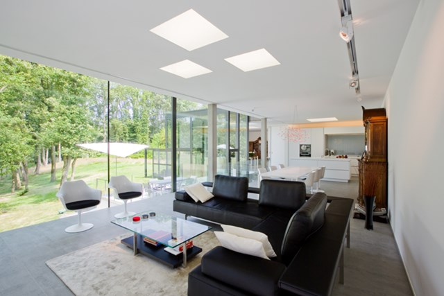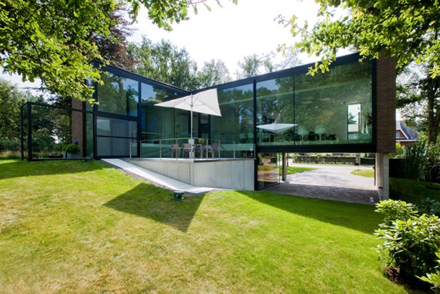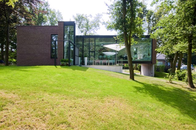 De L-vormige achtergevel is volledig beglaasd en uitgevoerd in SAPA aluminium profielen. Deze gevel loopt door tot onder het niveau van de leefruimte en is hoger dan het plafond in het interieur. Dit geeft de ervaring van buiten te leven en te wonen. De grote loofbomen rondom de woning zorgen voor een natuurlijk zonnescherm en het terras biedt beschutting tijdens hete zomerdagen.
