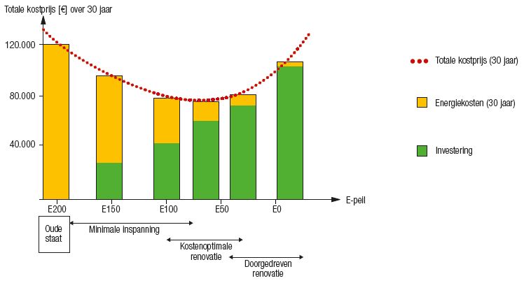 Er wordt ook al gewerkt aan concrete doelstellingen op langere termijn. In het kader van het Vlaamse Renovatiepact wordt bijvoorbeeld gedacht aan een minimumniveau waaraan alle bestaande woningen tegen 2050 zouden moeten voldoen. Deze langetermijndoelstelling kan vertaald worden naar een prestatie-eis op gebouwniveau (bv. een E-peil van om en bij E60) of naar eisen voor specifieke werkzaamheden (waarbij men streeft naar oplossingen die het niveau van de huidige nieuwbouw benaderen). Dit betekent dat zowel de schil als de installaties energiezuiniger zouden moeten zijn en dat men voor de wanden (muren, vloeren en daken) zou moeten streven naar U-waarden van om en bij de 0,15 à 0,25 W/m².K. Het gebouw zou eveneens voorzien moeten zijn van goed geïsoleerde, performante schrijnwerkelementen en beglazingen (Uw = 0,8 à 1,5 W/m².K). Ook een goede luchtdichtheid, een gecontroleerde ventilatie, installaties met een hoog rendement en een efficiënte verlichting kunnen in deze context hiertoe bijdragen.