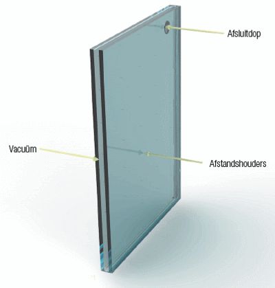 Dit vacuümprincipe wordt eveneens toegepast in beglazingen (zieafbeelding 1): tussen twee glaslagen wordt een vacuüm gecreëerd waardoor de warmteweerstand aanzienlijk verhoogt. De atmosferische druk wordt opgevangen door afstandshouders tussen de glasplaten. In theorie zou deze vacuümbeglazing een warmtedoorgangscoëfficiënt (U-waarde) van 0,4 W/m².K moeten bereiken. In de praktijk neemt men echter slechts U-waarden vanaf 0,9 W/m².K waar. Hoewel drievoudige beglazingen dus betere thermische prestaties behalen, biedt de beperkte dikte van vacuümglas (6,5 mm, vergelijkbaar met enkel glas) tal van voordelen voor de renovatie van historische gebouwen.