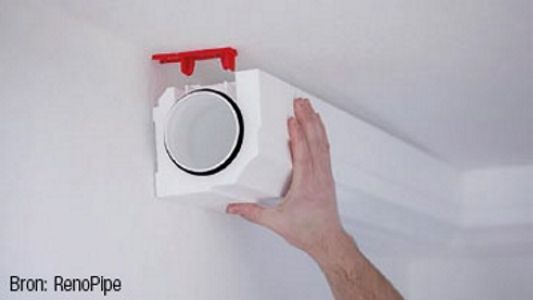 Een tweede mogelijkheid is de toepassing van een systeem waarbij de ventilatiebuizen zichtbaar aan het plafond bevestigd worden (bv. in de bovenhoeken, zie afbeelding 2). Doordat de afwerking in het systeem geïntegreerd is, zijn er geen verdere werken nodig om de kanalen te verbergen. Teneinde drukverliezen te beperken, dienen onnodige omwegen en bochten vermeden te worden en moet het debiet afgestemd zijn op de beperkte diameter van de kanalen.