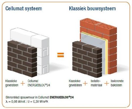 Een muur opgetrokken in Energiebloc haalt de normen voor lage-energiewoningen, zonder dat extra isolatiemateriaal moet worden toegevoegd. Met een Energiebloc (λ 0.08 W/mK) van 24 cm dikte is een U-waarde van 0.30 W/m²K haalbaar. Daarnaast is het beschikbaar in een dikte van 30, 36.5, 40 en 50 cm wat U-waardes van U=0.15 W/m²K mogelijk maakt.