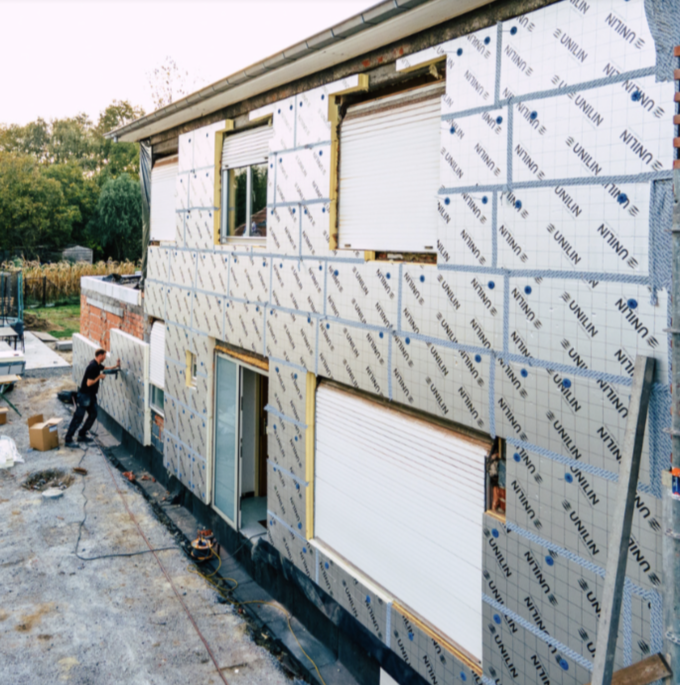 Door de isolatieplaten af te werken met Unitape garandeerde UNILIN een volledig winddichte gevel. Aannemer Sander is lovend enthousiast over het product: "Ik ben fan van Unitape! Het is makkelijk af te scheuren, plakt goed en je hebt er geen afval mee zoals bij dubbelzijdige tape het geval is."