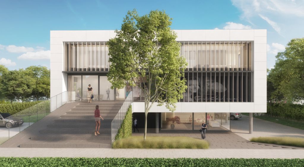 Het afhellend terrein biedt de mogelijkheid het gebouw op te tillen. De overdekte buitenparkings zullen zich onder het zwevend kantoorvolume bevinden. Duurzaamheid staat centraal in het ontwerpconcept.
