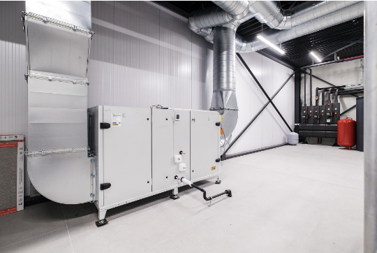 Een andere belangrijke techniek die bijdraagt tot meer duurzaamheid is het geavanceerde ventilatiesysteem. Ventilair Group stelde voor om twee standaard luchtgroepen van Komfovent te plaatsen, met respectievelijk een debiet van 3.000 en 4.000m³/h. Deze oplossing beantwoordt aan de wettelijke norm voor werkplekventilatie.