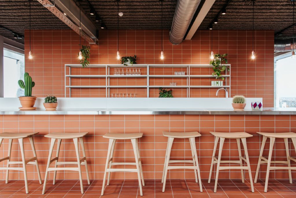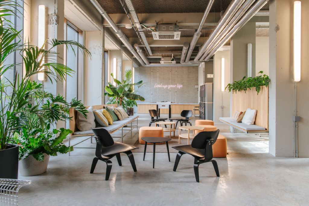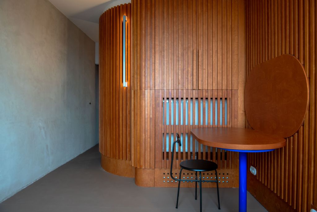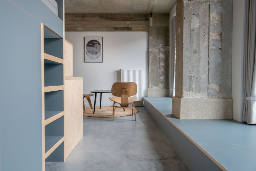 De afwerking van het interieur vertrekt vanuit de huidige toestand en pretendeert niet een nieuwbouw te zijn. Littekens uit een vorig leven worden omarmd en mee verwerkt in het stoere karakter van het gebouw. “‘Ruwbouw is afbouw’ vinden we steeds een waardevol uitgangspunt, waar de structuur zichtbaar kan blijven wordt dat aangemoedigd”, aldus enofstudio. De kamers zijn voorzien van multifunctionele meubels in fris gekleurd plaatmateriaal. Collectieve delen kregen een warme, huiselijke materialiteit en zachte kleuren. Lichtgrijze wanden en meubels in multiplex voor de begane grond en aardkleurige terracotta-tegels in de skylounge.