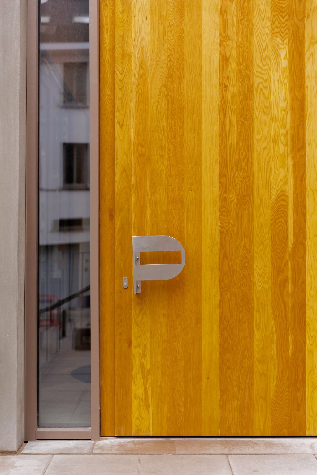 Een strategische opstelling van de functies zet deze geleding kracht bij. Ter hoogte van de onderste lagen - waar een deel van de gemeenschappelijke functies worden voorzien - is de gevel meer opengewerkt en zoekt de plint aansluiting met het openbaar domein. De ooit zeer gesloten gevel gaat op deze manier een heldere en uitnodigende relatie aan met de straat.