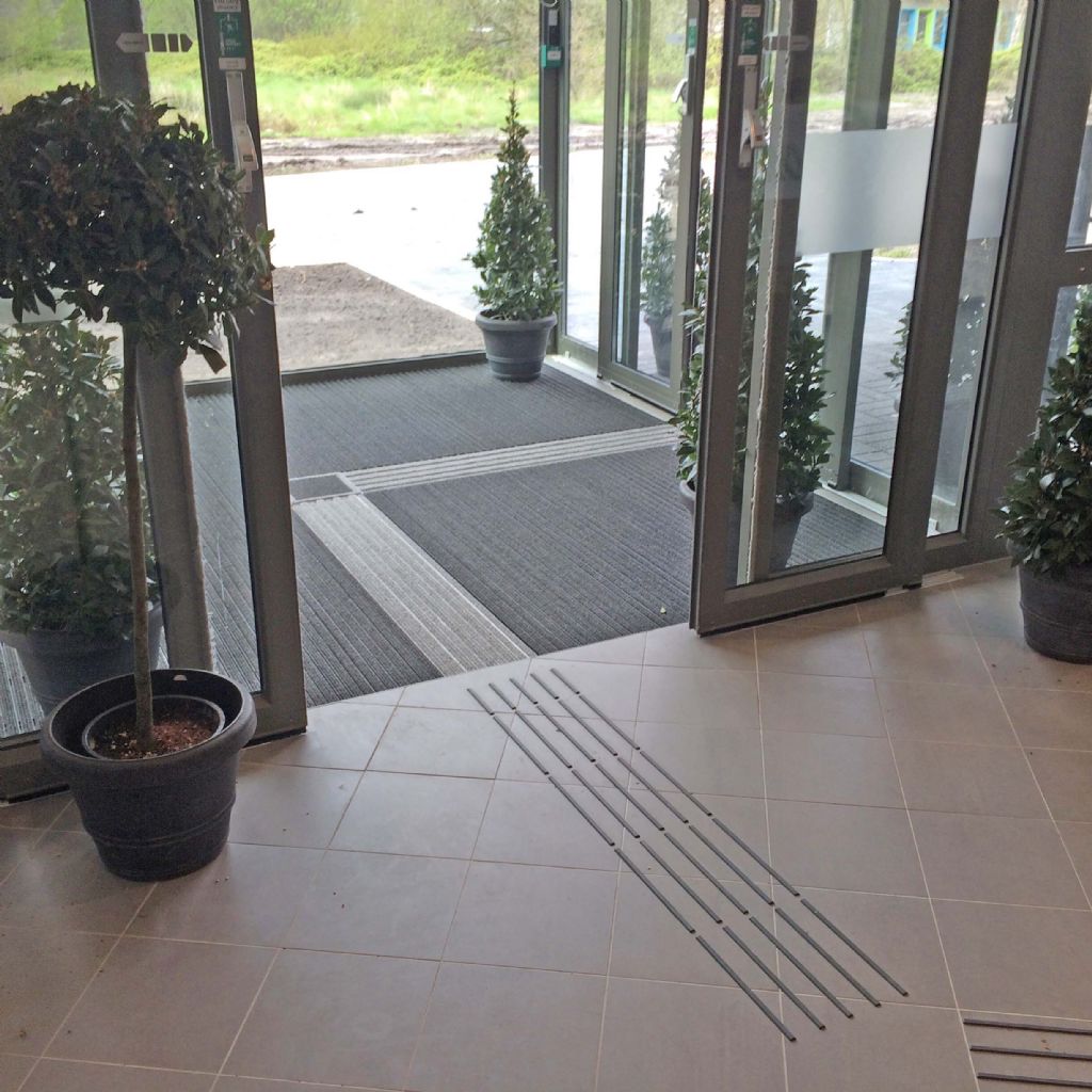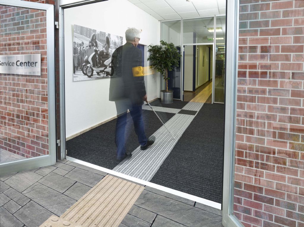 Met de entreemat met gidssysteem kunnen gebouweigenaren anticiperen op het toenemende aantal mensen met een visuele beperking. Het gidssysteem bestaat uit robuuste roestvaststalen elementen met een esthetisch mooie vormgeving. Het grote vierkante element is uitgevoerd met noppen en fungeert als herkenning bij kruispunten. De tegels met een breedte van 122 of 300 mm, dienen als oriëntatie van de looprichting.