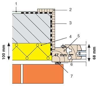Vensteraansluiting waarbij de isolatielaag van de gevel rechtstreeks aansluit op het vaste raamkader (Legende: 1.Pleister 2.Houten dagkant 3.Luchtdichtheidsmembraan 4.Isolatie (MW) 5.Houten venster 6.Gevelkit 7.Rugvulling)