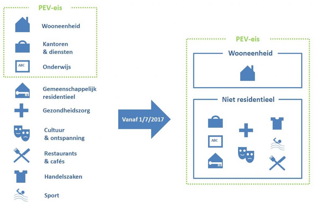 Na de woningen, kantoren en scholen, reeds in 2015, wordt de eis betreffende het primair energieverbruik (PEV) vanaf 1 juli 2017 nu uitgebreid naar alle niet-residentiele bestemmingen zoals rusthuizen, ziekenhuizen, zwembaden, sporthallen, …