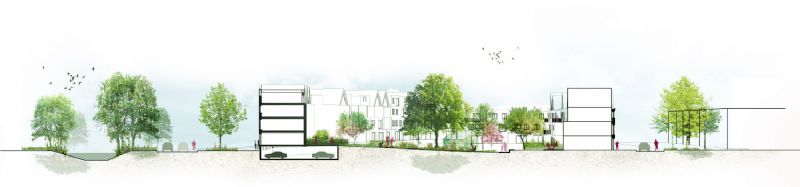 De twee delen worden gescheiden door een lange zitbank. Bomen en een moestuin werken het geheel af en leveren “een plek van rust, samenkomen, tuinieren en spelen.” Enkele daken zijn ook groen -DELVA ondertekent het "rainproof" manifest.