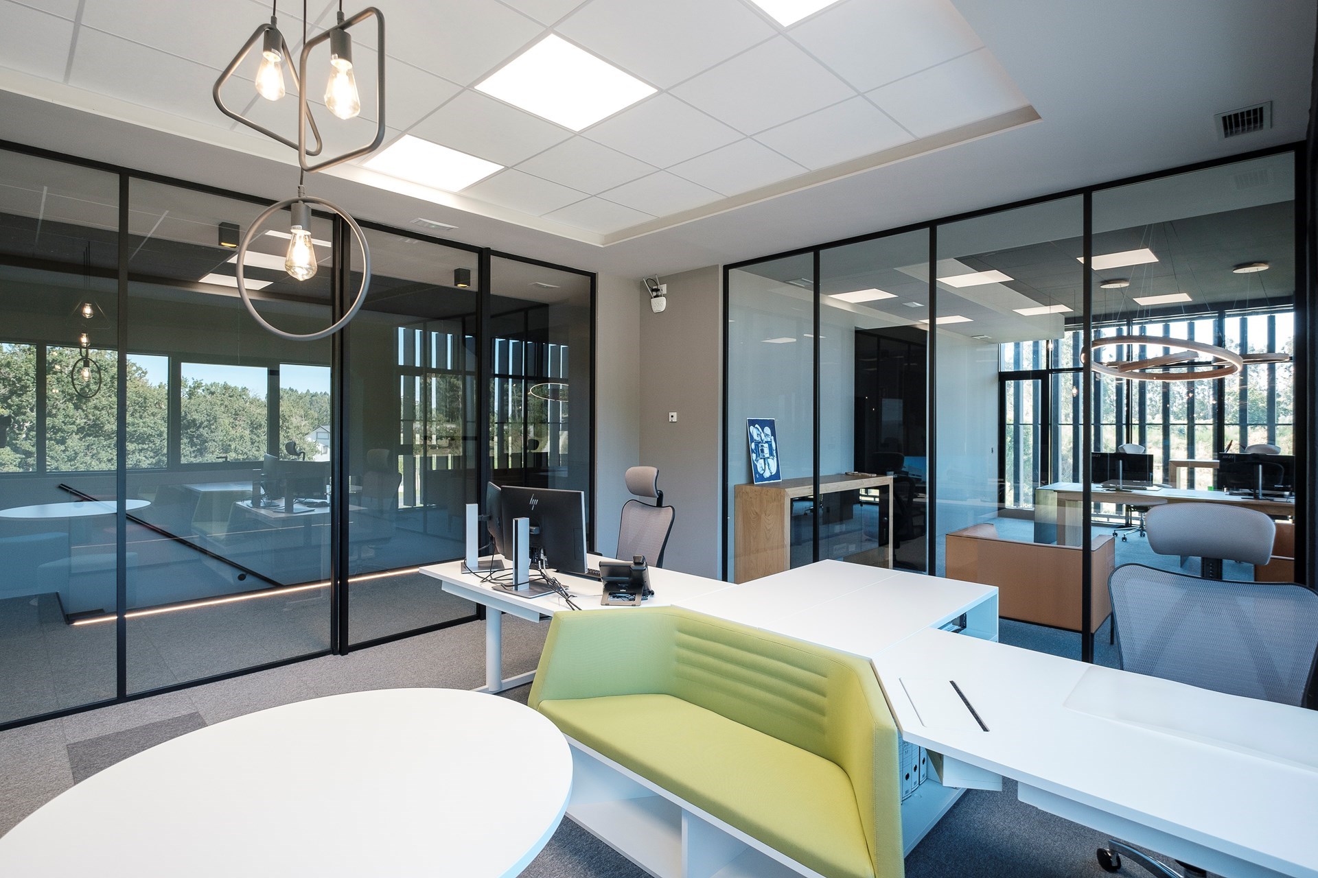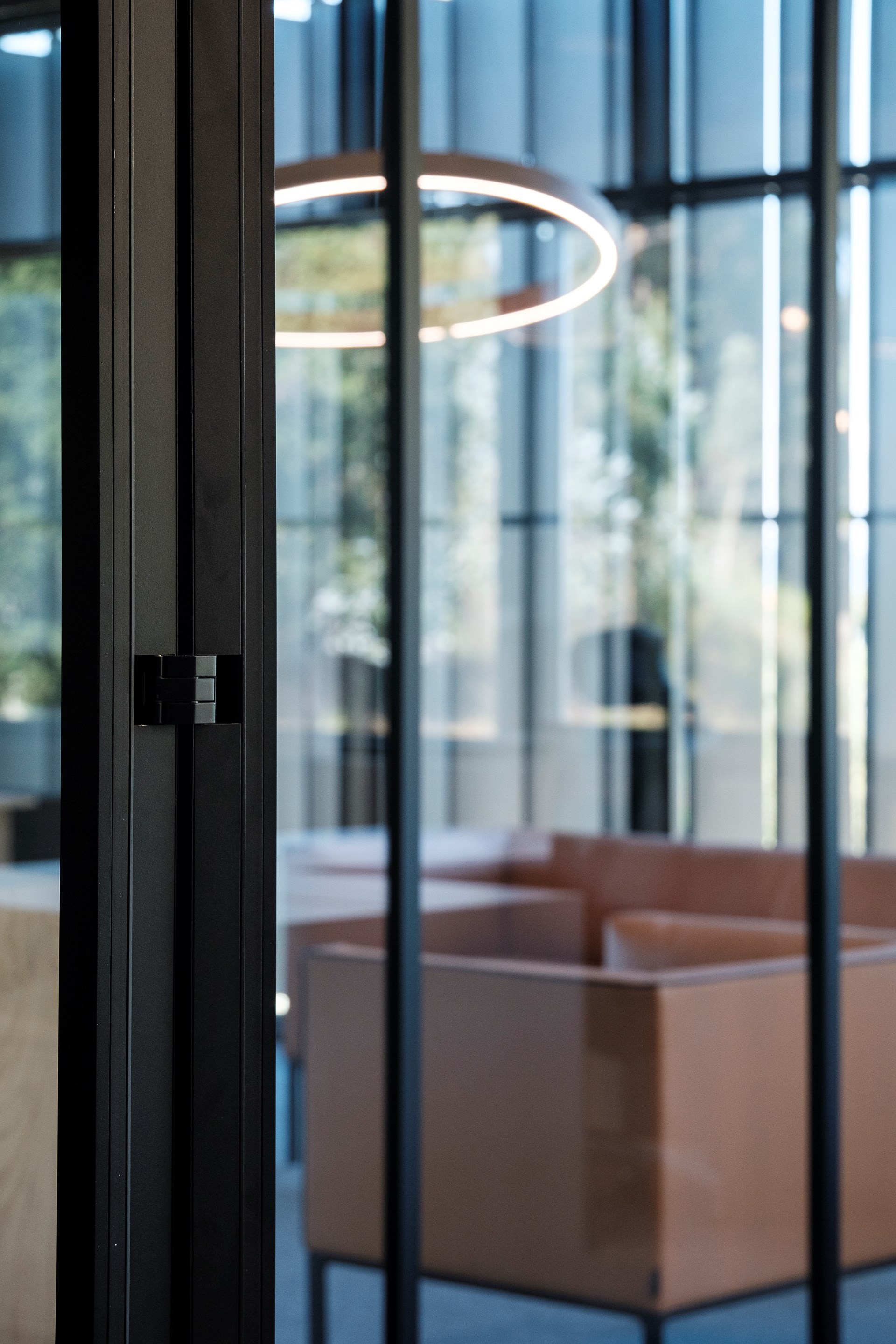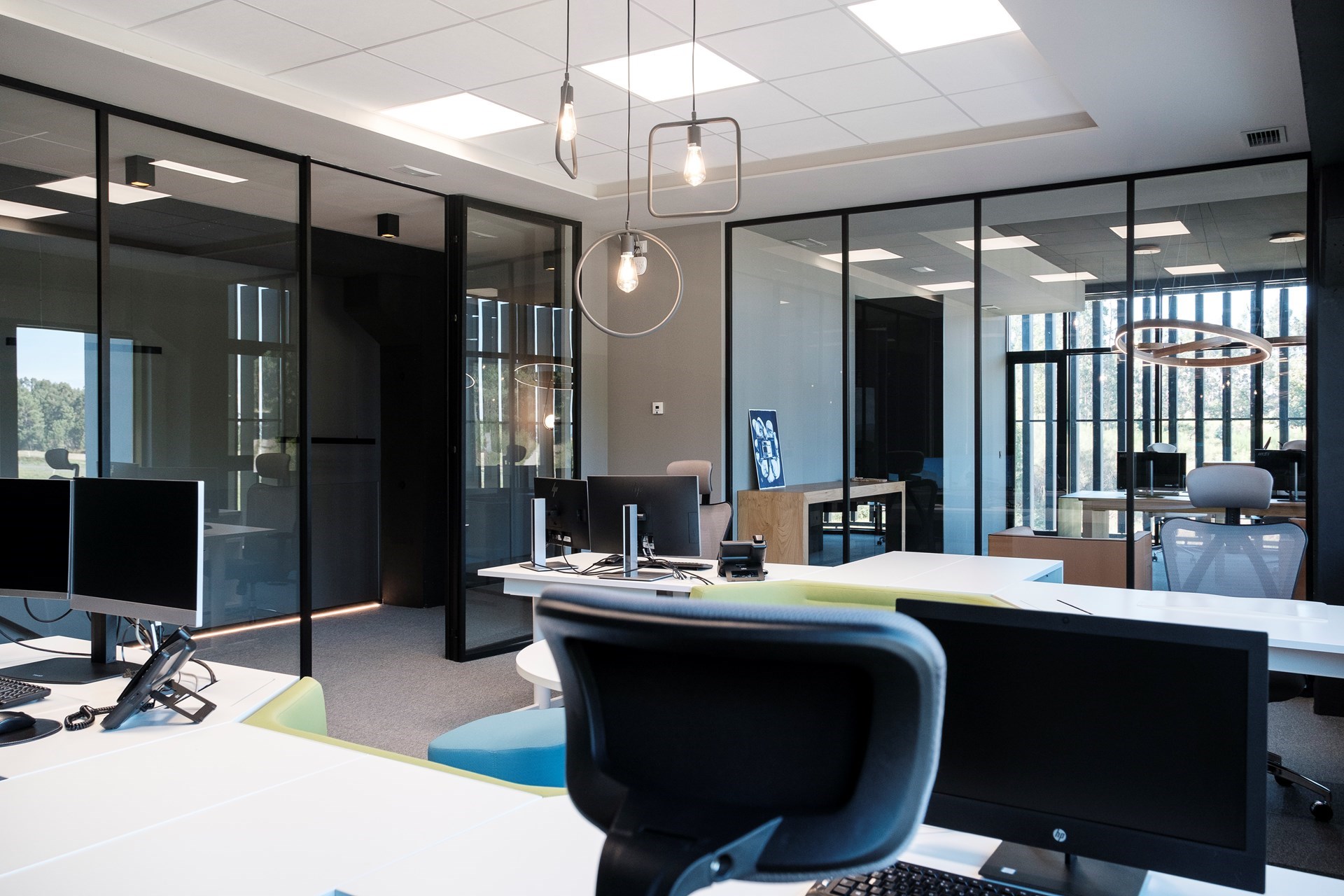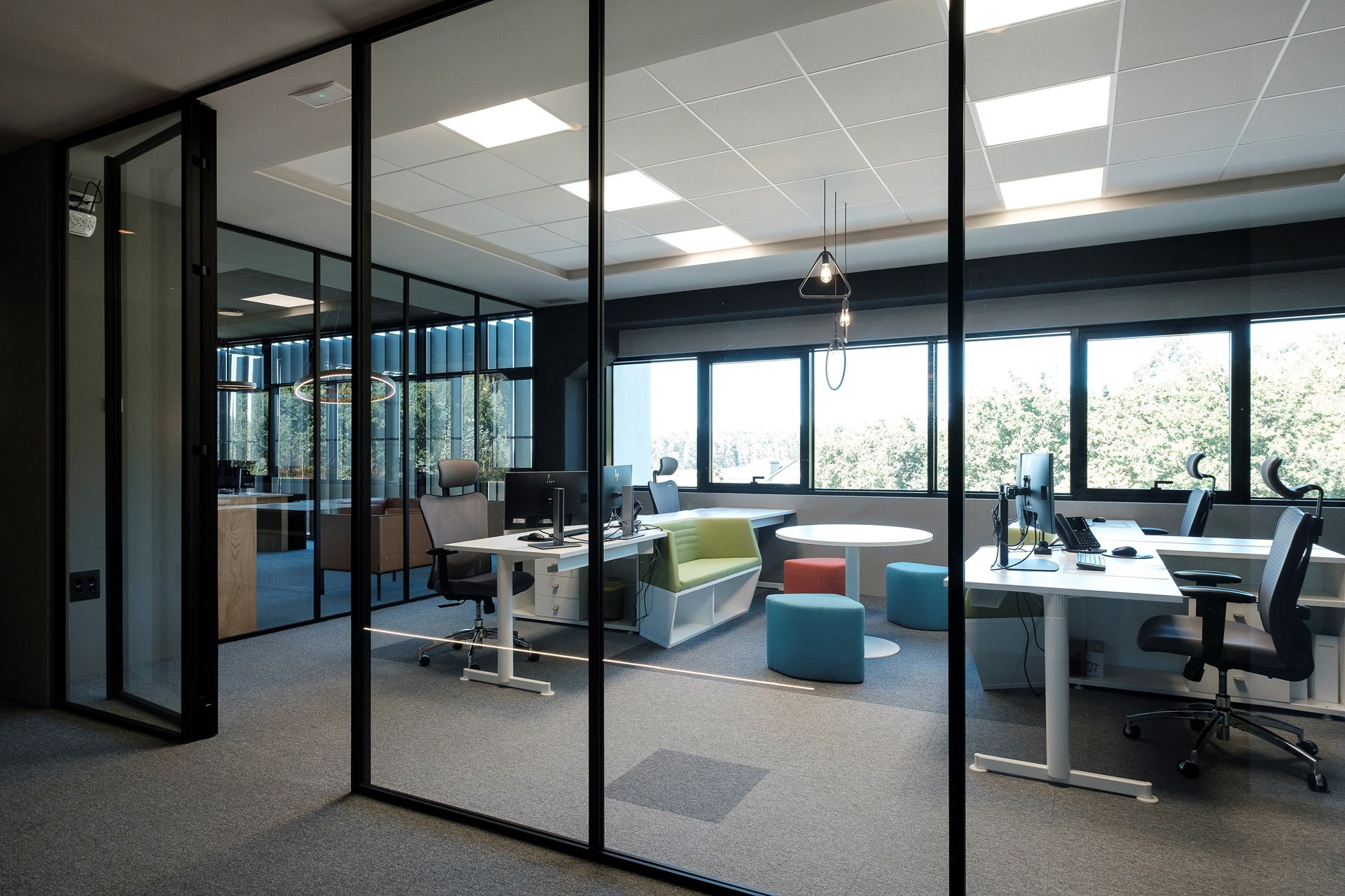 Compartimenteren met vaste glazen wanden zorgt voor een grotere doorstroming van het daglicht en laat de ruimte optisch groter lijken. Geluiden en stemmen worden gedempt zodat telefoongesprekken of meetings ongestoord kunnen plaatsvinden. De strakke aluminium profielen creëren een minimalistische inrichting terwijl de goed uitgedachte volumes in de ruimte voor een open geheel zorgen. Missie geslaagd.