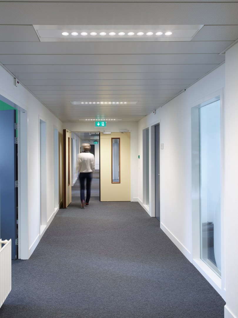 ETAP voerde vorig jaar de eerste werken uit. In die eerste fase werden de gangen van het bestuursgebouw in Tilburg aangepakt. Concreet werden 63 fluorescentielampen en het binnenwerk van de reflectorarmaturen waar de lampen inhingen vervangen door een U7-refurbishmentmodule van ETAP. De module bevat een zogenaamde LED+LENS-optiek en werd uitgevoerd in een aangepaste kleur om de kleur van het plafond zoveel mogelijk te benaderen. “Met onze renovatie- of refurbishmentmodules kan je oude armaturen snel en circulair upgraden van fluorescentielampen naar led. De originele behuizing en aansluiting en het plafond blijven intact. Het binnenwerk is wel nieuw, met nieuwe bedrading en een ledlichtbron”, legt ETAP uit.