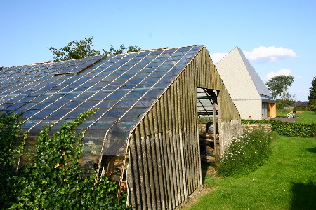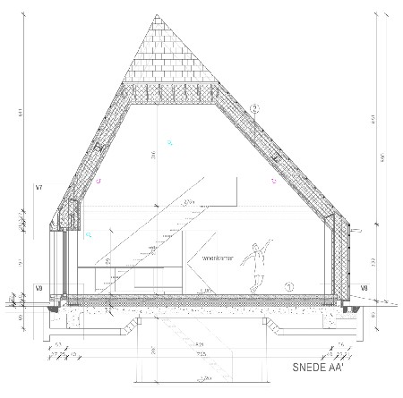 De compactheid en de eenvoud van het volume betekenden een aanzienlijke vermindering van het aantal details voor de bewaking van de luchtdichtheid en de continuïteit van de isolatie. Om de onregelmatige vorm van het dak te kunnen realiseren, werd de woning opgetrokken als een staalskelet, ingevuld met een houten raamwerk. In dit raamwerk werd de thermische isolatie geplaatst, waarna het aan de binnenzijde werd afgewerkt met OSB-plaat. Deze oplossing biedt het voordeel dat de buitenwanden veel slanker kunnen zijn dan bij traditionele baksteenbouw.