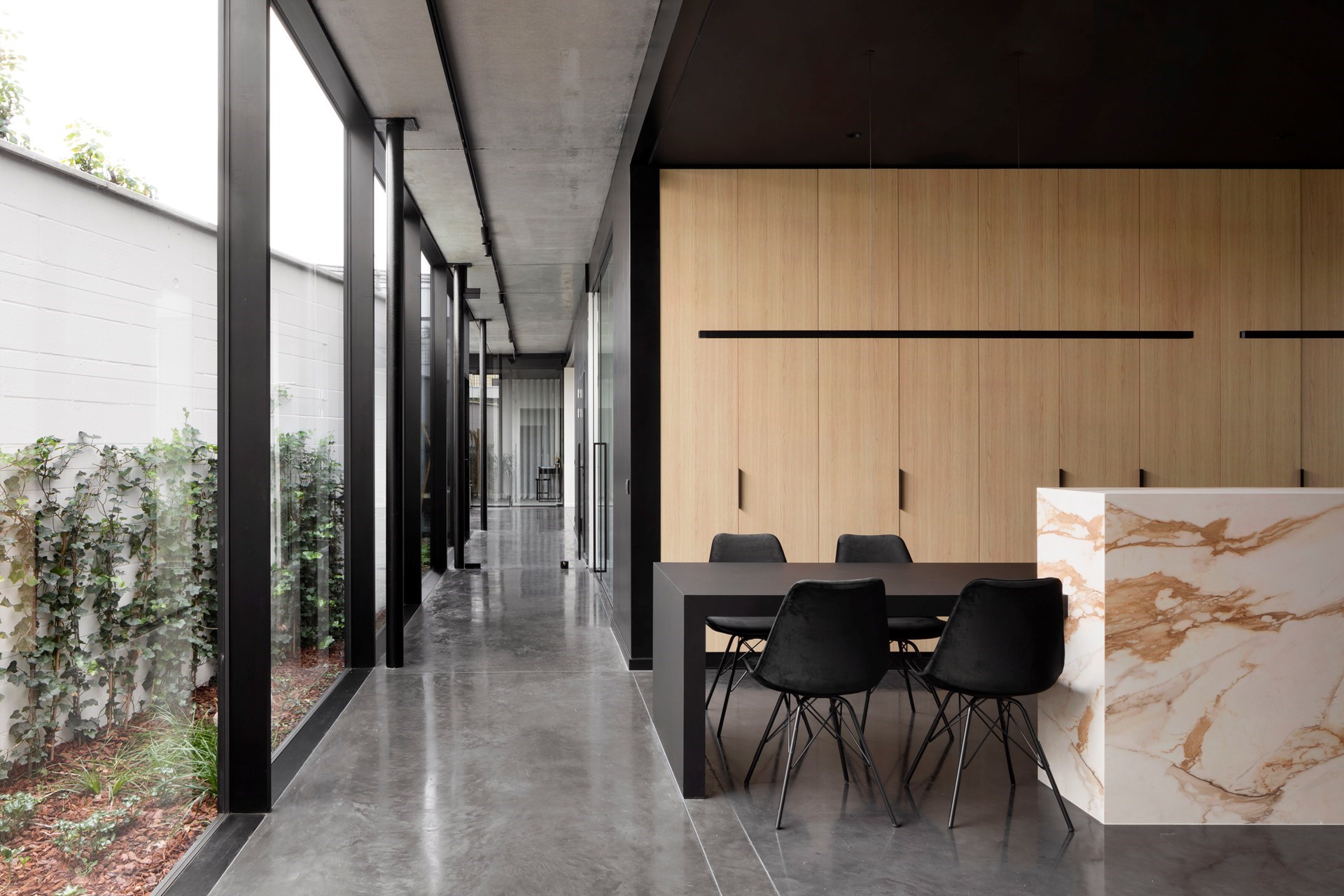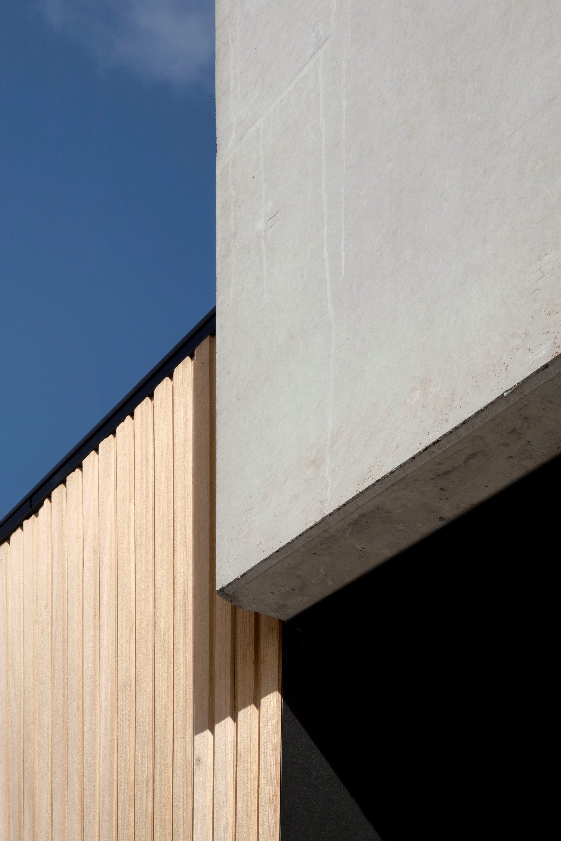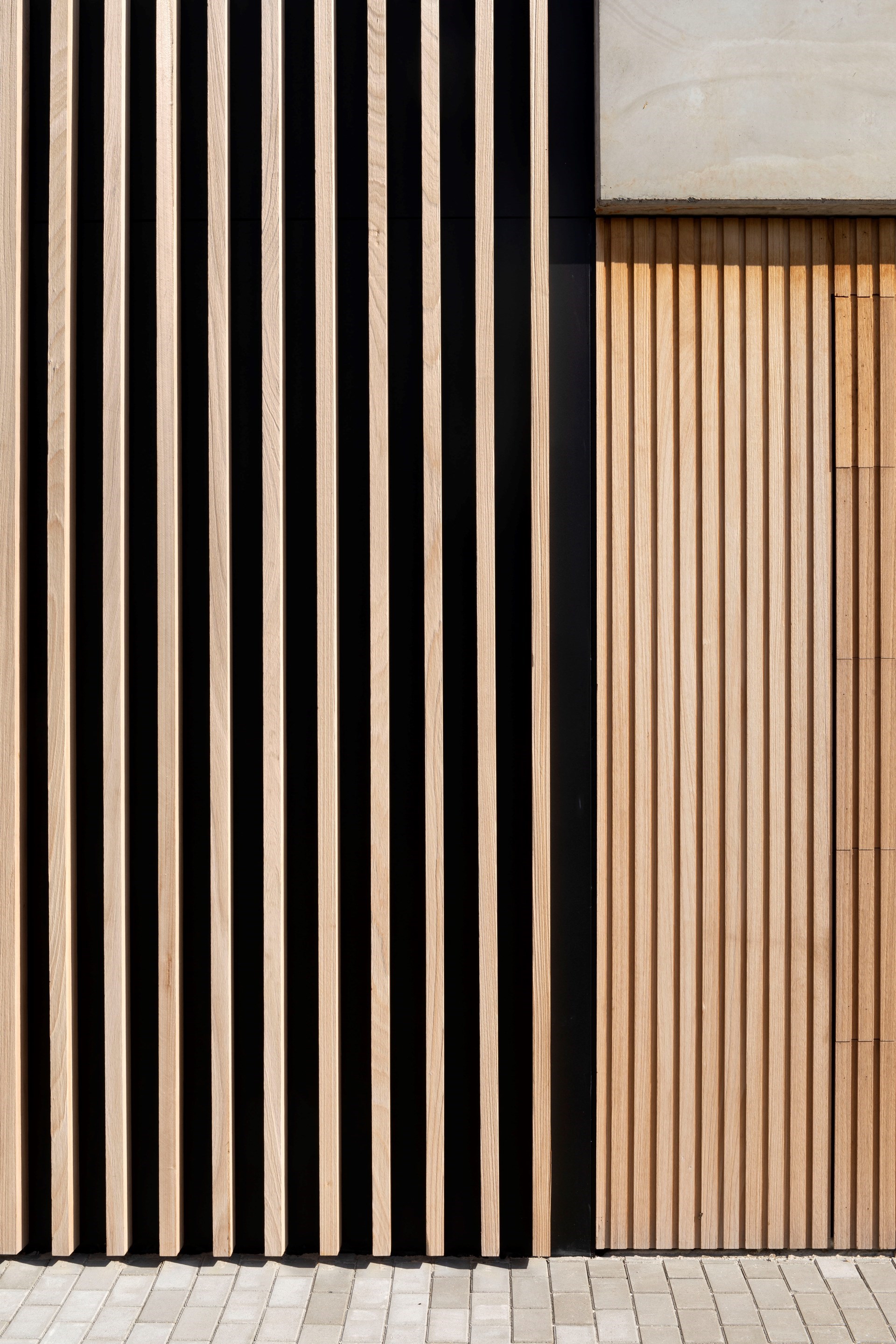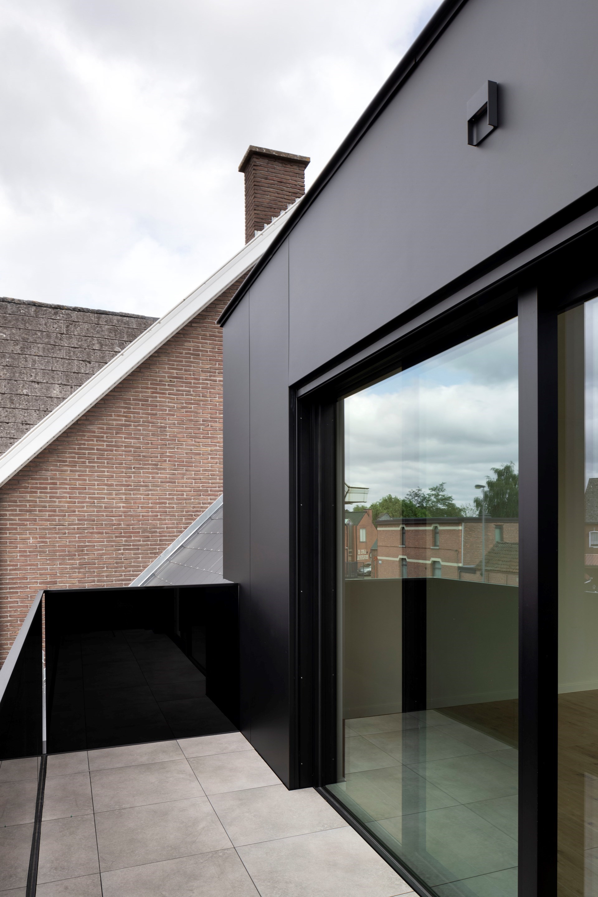 De gevel is een opvallende compositie van drie materialen die in verschillende texturen werden toegepast. De grote gevelpanelen in zichtbeton springen hierbij het meest in het oog.