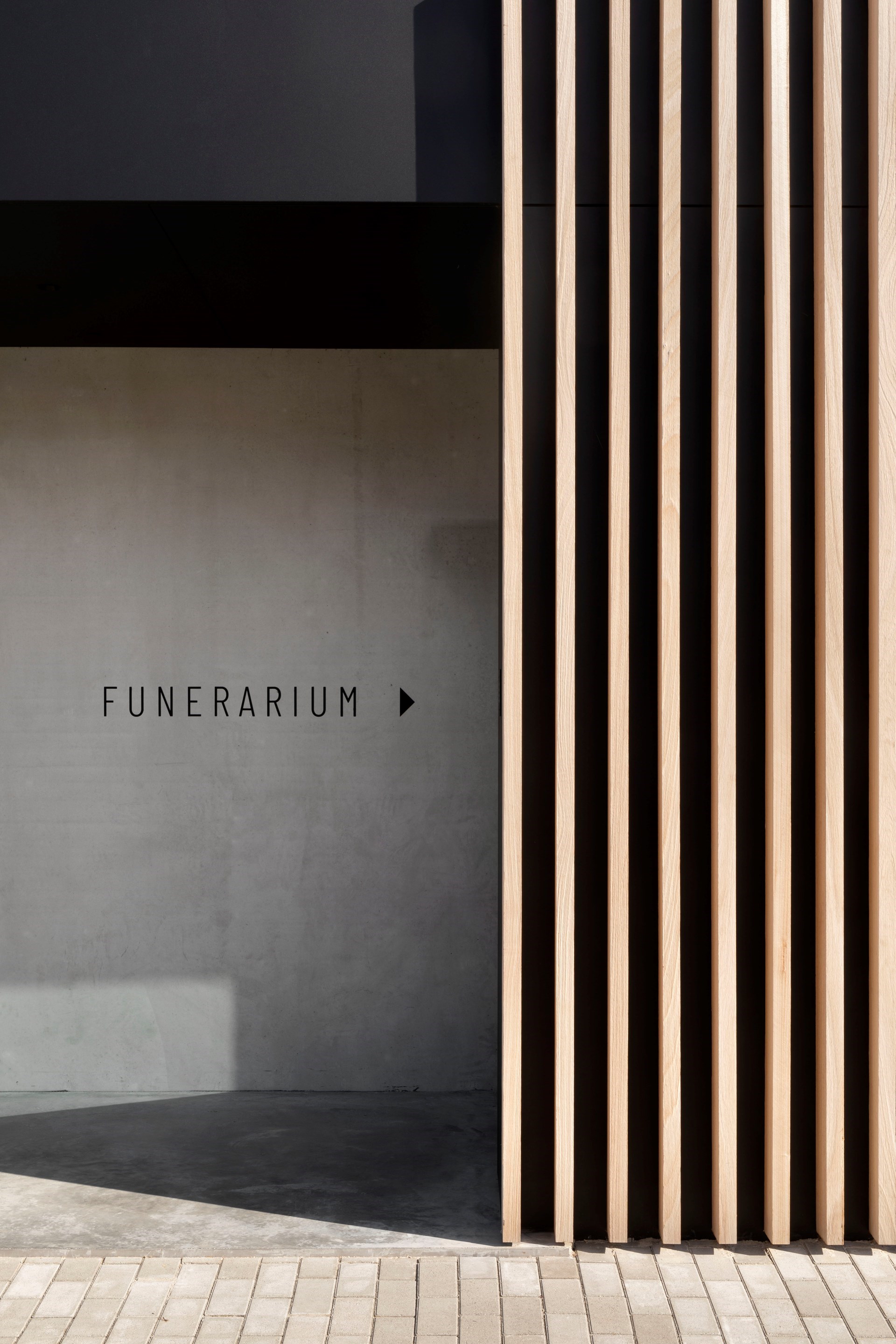Via een compositie van open delen zoals de inkom en terrassen en gesloten delen zoals het rouwcafé, de logistieke ruimtes en de garage, ontstaat een krachtig gevelconcept dat de schaal van de omgeving overneemt. De hoofdingang van het gebouw situeert zich ter hoogte van een overdekte inkomzone en is direct gelinkt aan een centrale ontvangstruimte. Deze ruimte is de meest publieke functie in het gebouw en fungeert als buffer tussen het openbaar domein en het uitvaartcentrum.