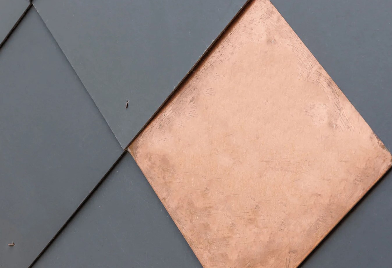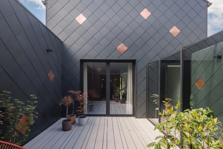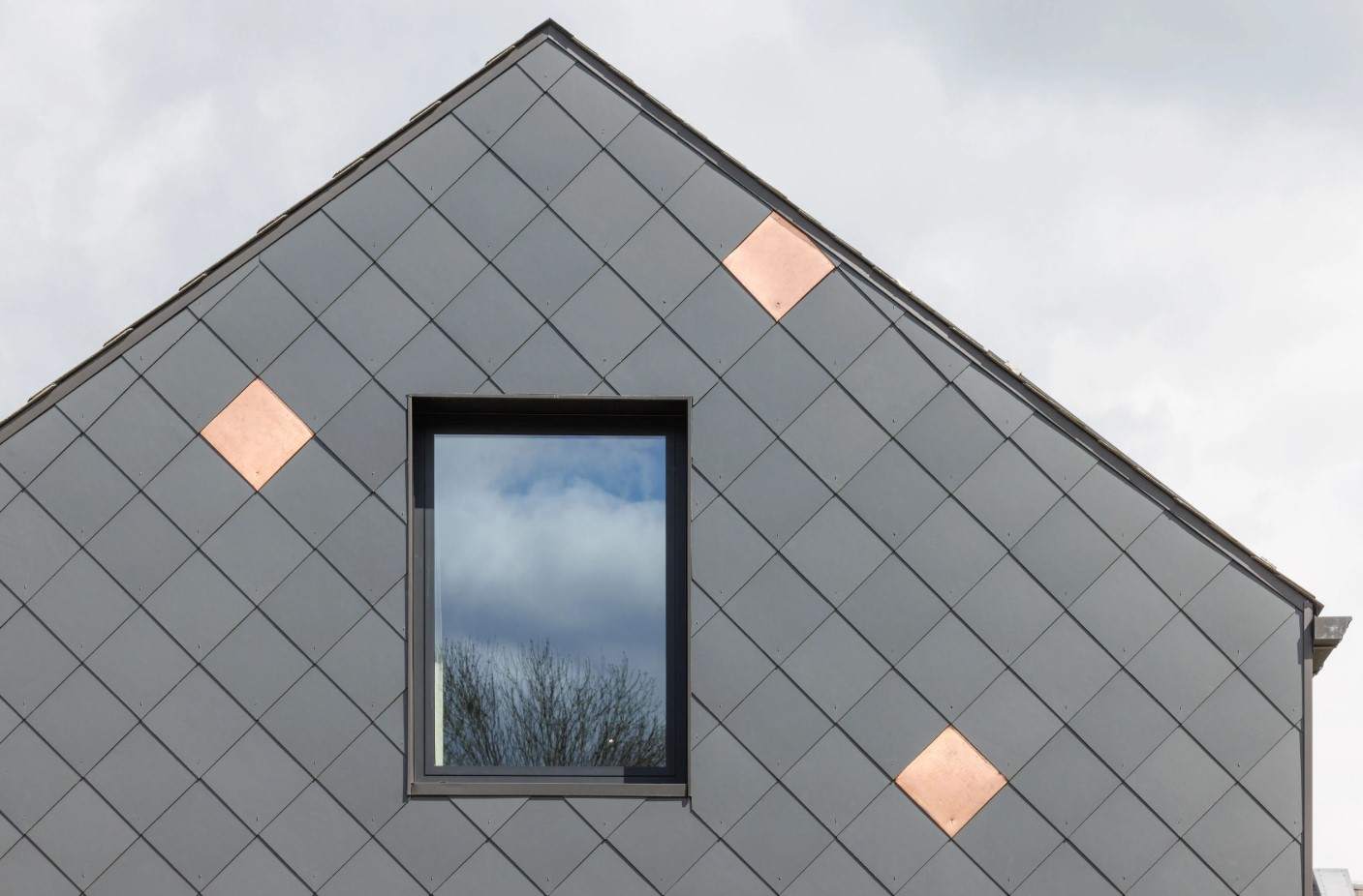 Voor Florence Abras lag de keuze voor Cedral voor de hand. "Door de veelzijdigheid van het materiaal konden we alle volumes 'inpakken', waardoor het geheel eigentijdser oogt. Om de bekleding een kleurrijker, warmer en stijlvoller tintje te geven, hebben we hier en daar ook enkele koperkleurige leien geïntegreerd. In de overdekte gang van de patio hebben we de binnenmuren eveneens bekleed met leien om binnen en buiten naadloos in elkaar te laten overvloeien", besluit Florence Abras.