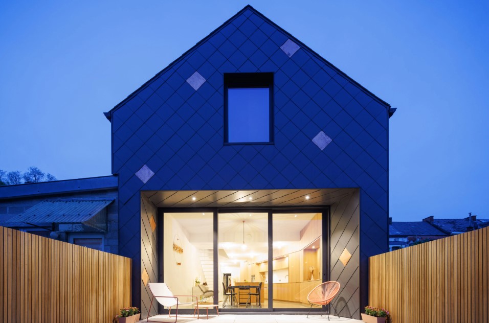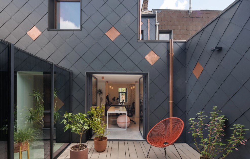 De expertise en de kwaliteit van de materialen van Cedral boden soelaas. "De bestaande context was nogal heterogeen: een rijhuis in geschilderde baksteen, een hanger, uitbreidingen met plat dak, daken in plaatstaal, zichtbare blokken, bepleistering, volumes met verschillende hoogtes ... Het leek ons dan ook vanzelfsprekend dat we er één geheel van moesten maken. Op de voorgevel na werden het dak en de gevels bijgevolg integraal bekleed met Alterna ruitleien in donkergrijs."