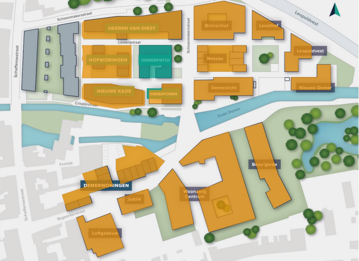 De naam ‘Ezeldijk’ verwijst naar het rijke verleden van Diest, toen ezels bootjes met graan naar de plaatselijke molen voerden via de dijk langs de Demer. Anno 2023 zijn zowel de historische Ezeldijkmolen als de rivier in ere hersteld en vormen ze samen het kloppend hart van een nieuwe stadswijk, waaraan in april de laatste hand werd gelegd. Na de realisatie van de woonzorgcampus met aanpalende residentiële voorzieningen (fase 1) en de woonblokken tussen de Leopoldvest en de Oude Demer (fase 2) door aannemer Democo nam projectontwikkelaar Ciril ook het gedeelte tussen de Schoenmakersstraat en de opengelegde rivier onder handen. “Daar bouwde Democo nog eens vier appartementsgebouwen (‘Heeren van Diest’, ‘Demerpatio’, ‘Nieuwe Kade’ en ‘Demertoren’) en zes grote ‘Hofwoningen’, aangevuld met elf kleinere ‘Demerwoningen’ aan de overkant van de rivier die werden opgetrokken door D-Build”, vertelt Jan Knippenberg, Project Developer bij Ciril. “Op de omgevingsaanleg na is het project volledig klaar, een vijftiental jaar nadat we de Euro Shoe-site aankochten.”