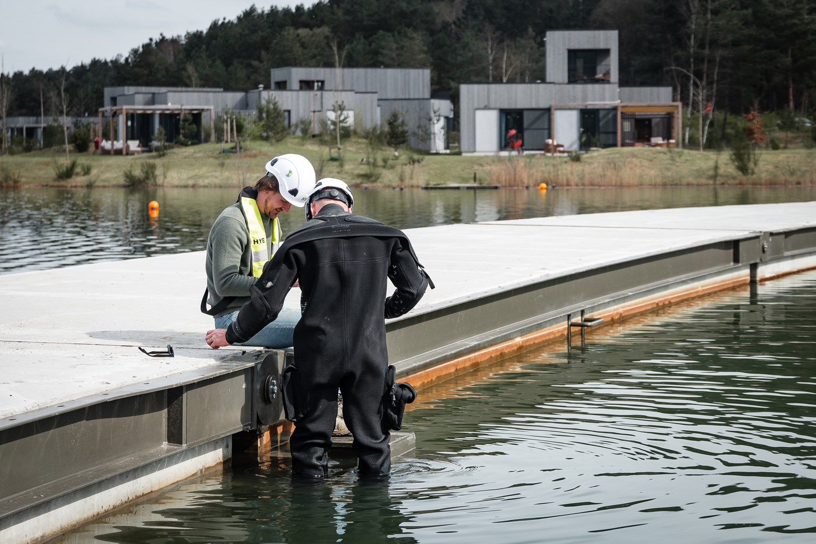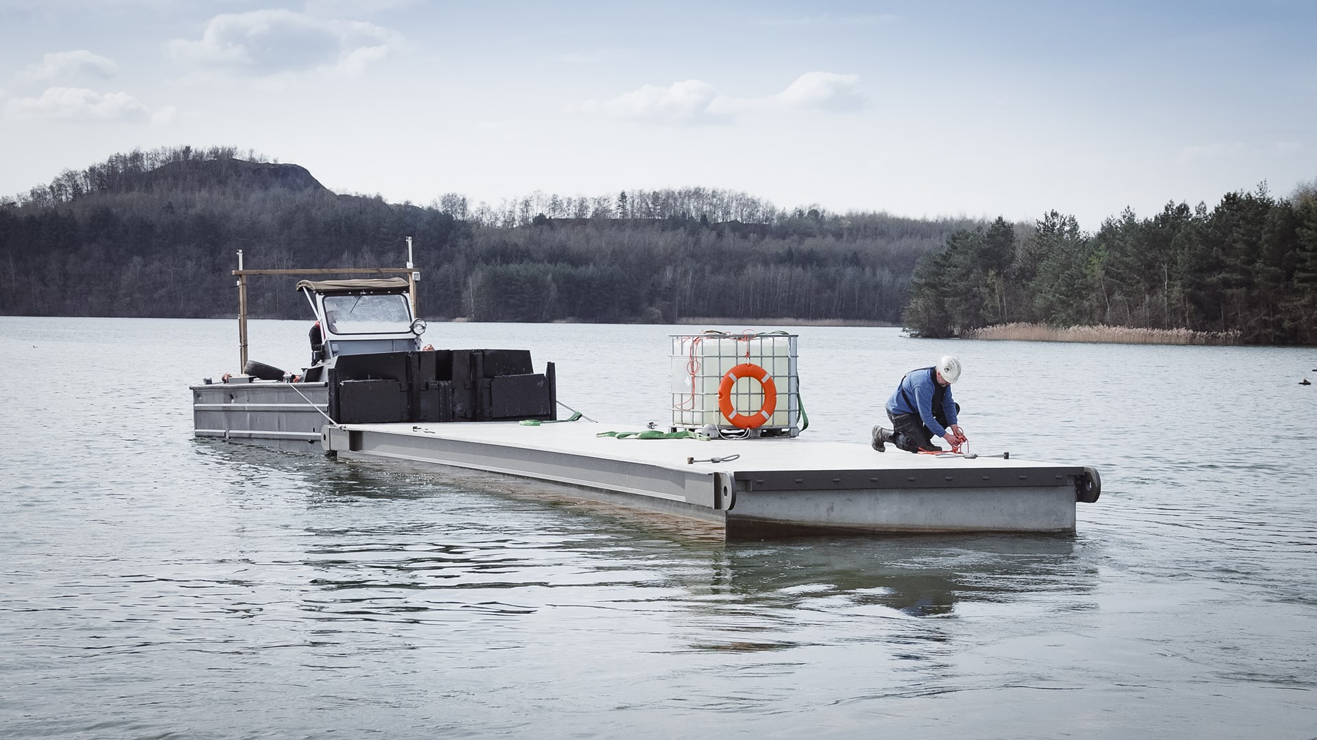 De prefab betonelementen, elk 40 ton zwaar en met afmetingen van 13,50 m bij 3,30 m, zijn 2 m hoog en steken dankzij de wet van Archimedes exact 50 cm boven het water uit. EPS-blokken dienden als verloren bekisting en verlenen extra drijfvermogen. De brug is verankerd aan 15 stalen buispalen, diep ingeheid in de bodem van het meer.
