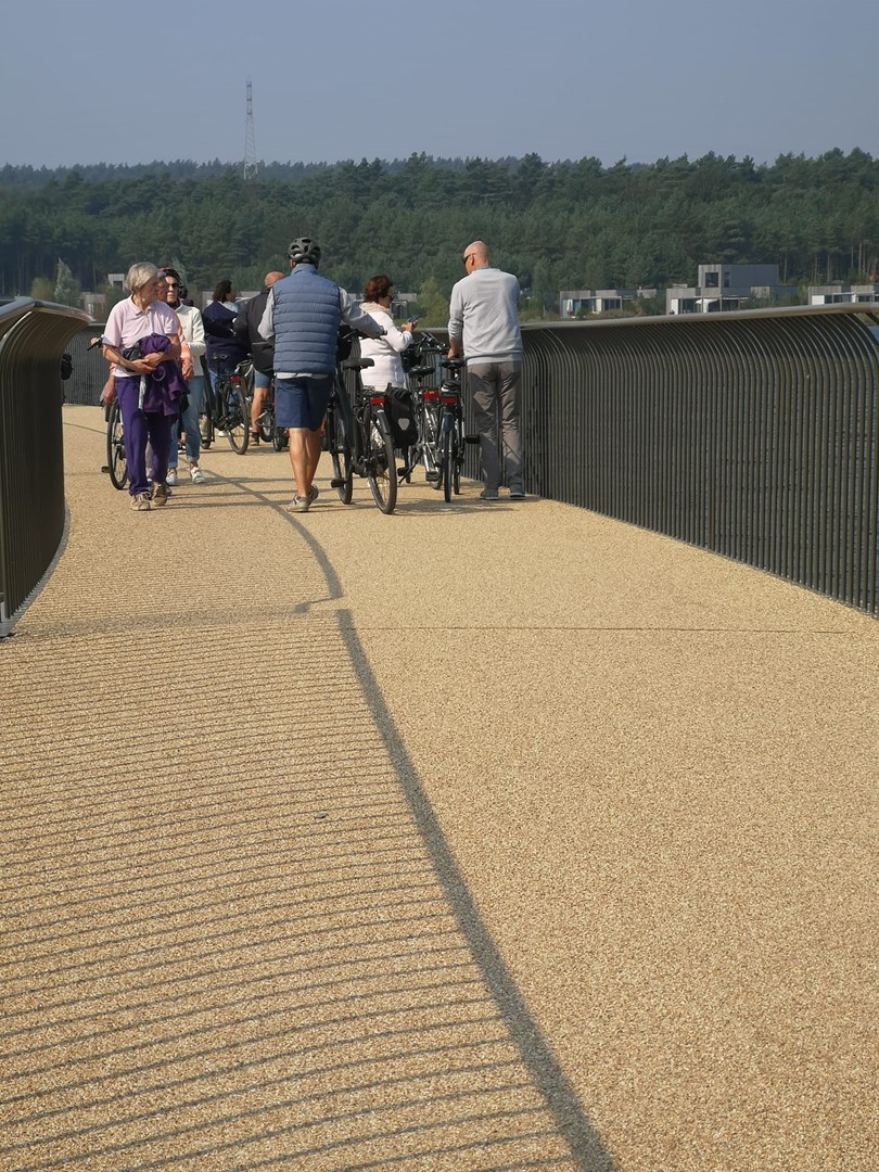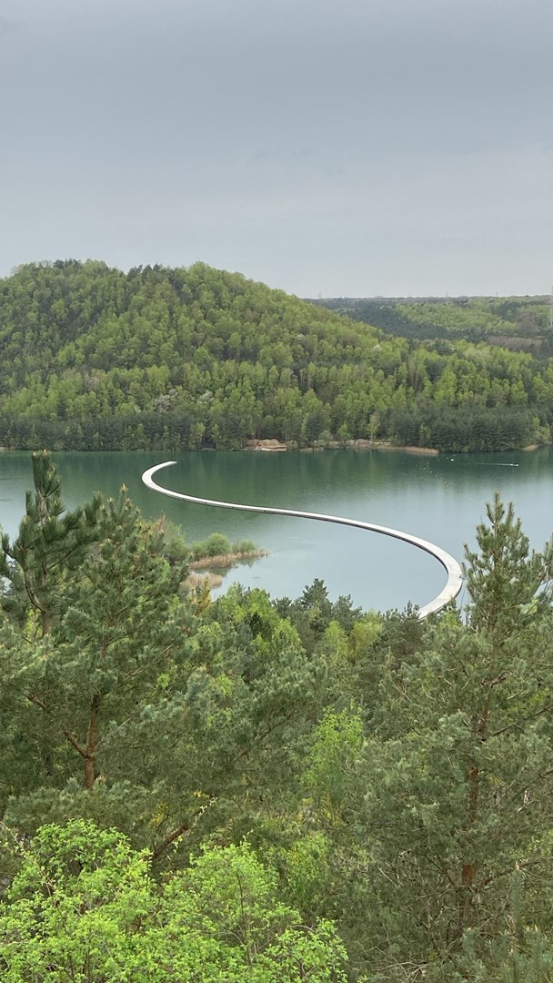 Na het succes van fietsen door het water en fietsen door de bomen, is het nu ook mogelijk om er te fietsen óp het water. Aannemer HYE bouwde er een 400 m lange, drijvende fietsbrug, ontworpen als een slingerende pontonbrug over het water, geïnspireerd door de gulden snede. Deze S-vormige fiets- en voetgangersbrug werd gerealiseerd in opdracht van de Limburgse Investeringsmaatschappij LRM en mee gefinancierd door de Provincie Limburg.