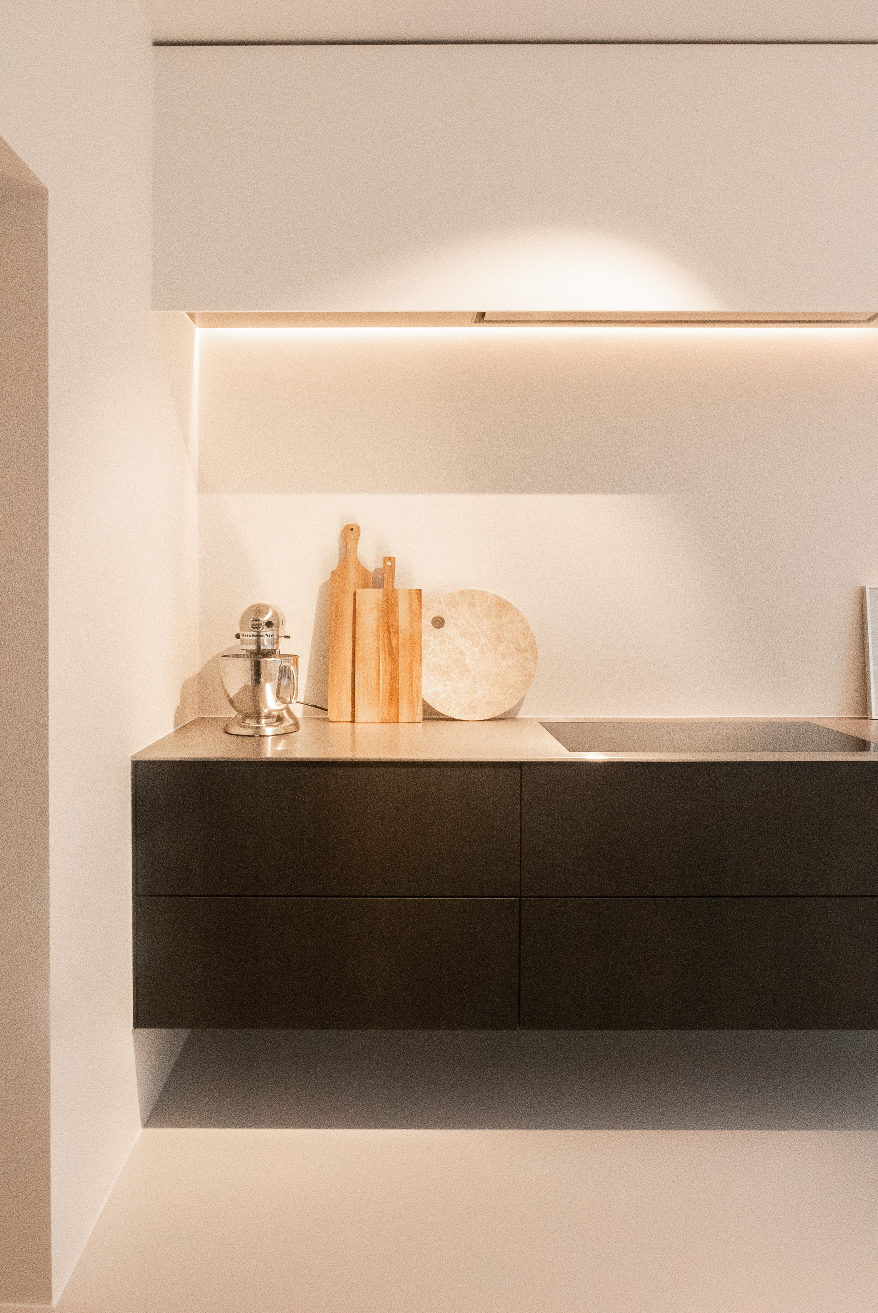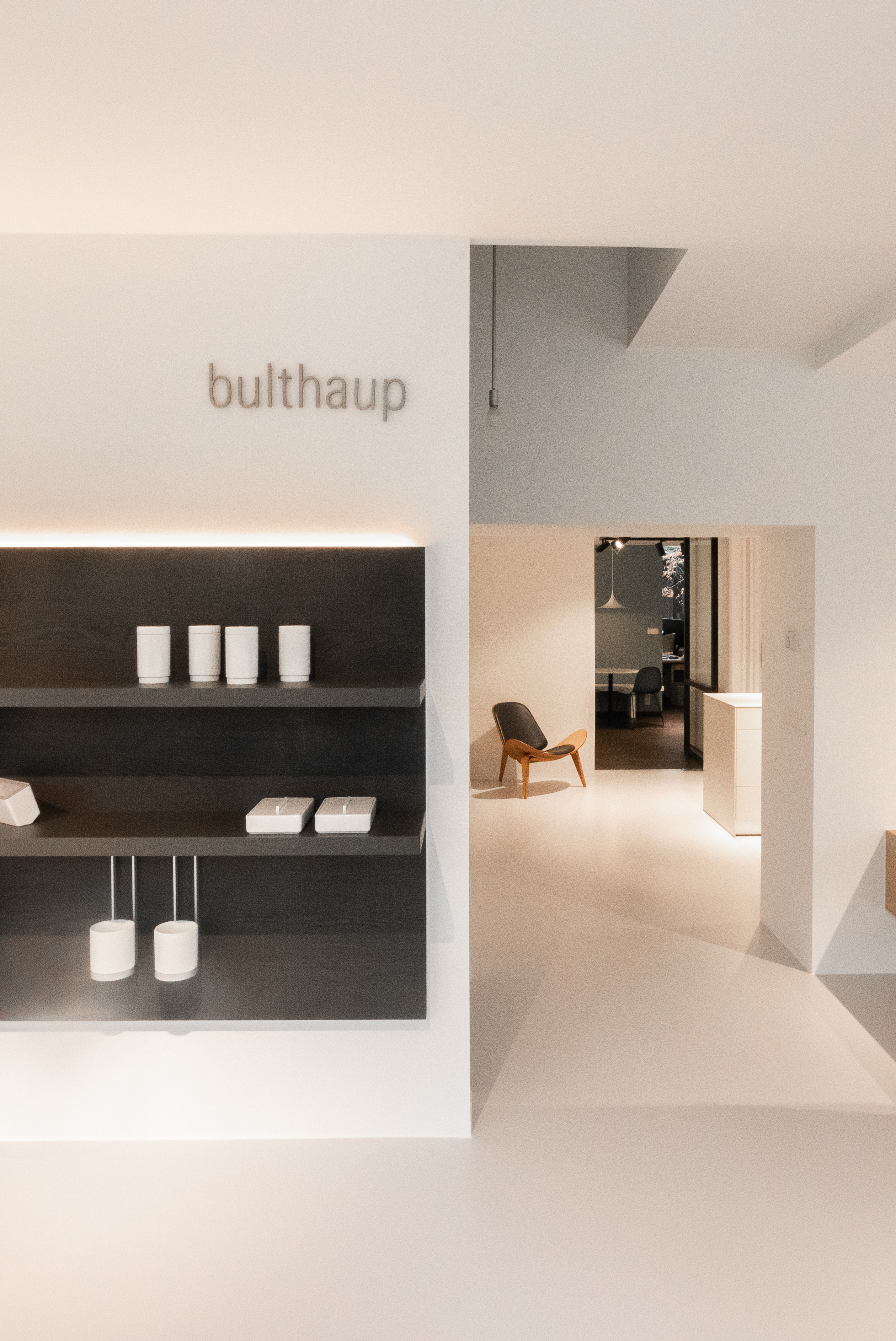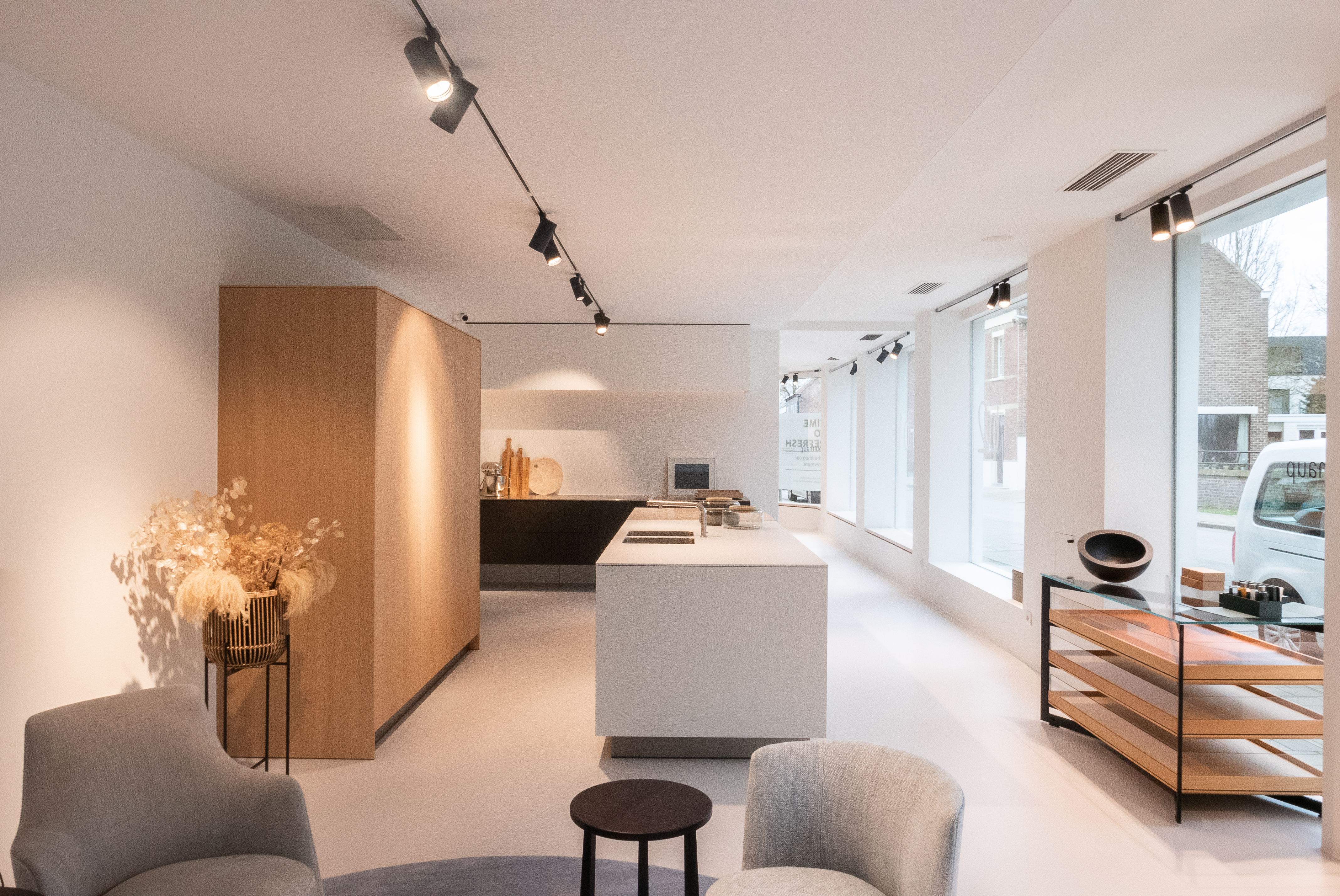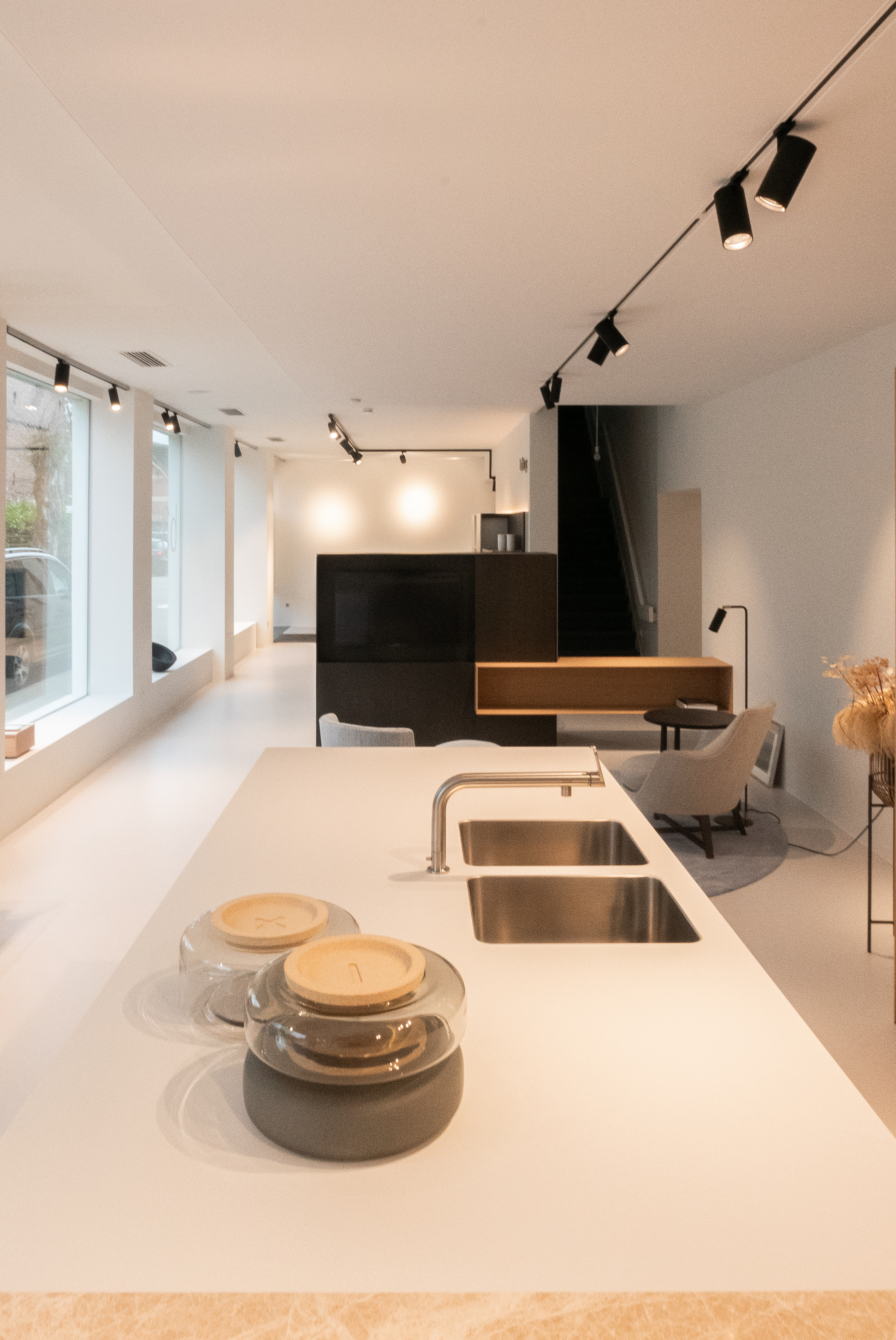 Hoewel de showroom 400 m2 groot is, werden het aantal getoonde keukens sterk verminderd. “We wilden terug naar de essentie: bulthaup-keukens zijn om in te leven, koken en genieten. De nadruk ligt bewust op meer gezelligheid, zoals je die ook thuis zou ervaren”, vertelt Katrien Van Damme. Vanaf nu worden open leefkeukens in de showroom afgewisseld met rustpunten zoals een salon of bureauruimte. Dankzij de combinatie van persoonlijke details, unieke designstukken en warmgekleurde muren heerst er bovendien een gemoedelijke sfeer.