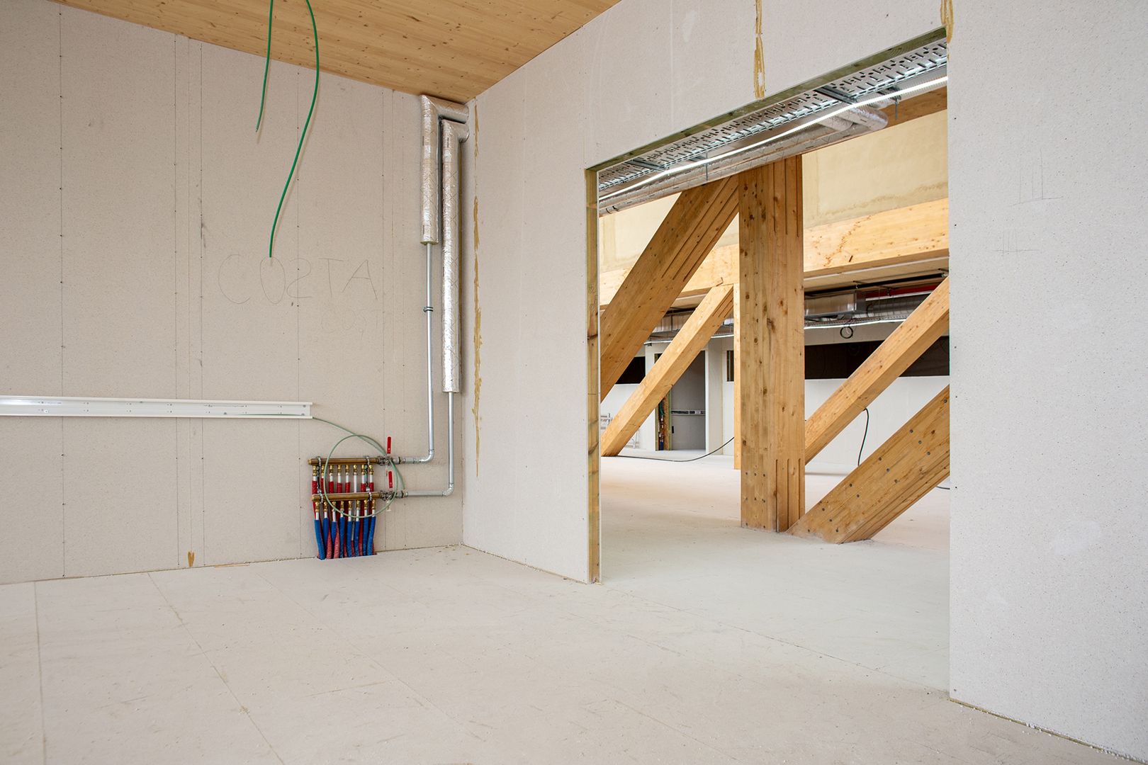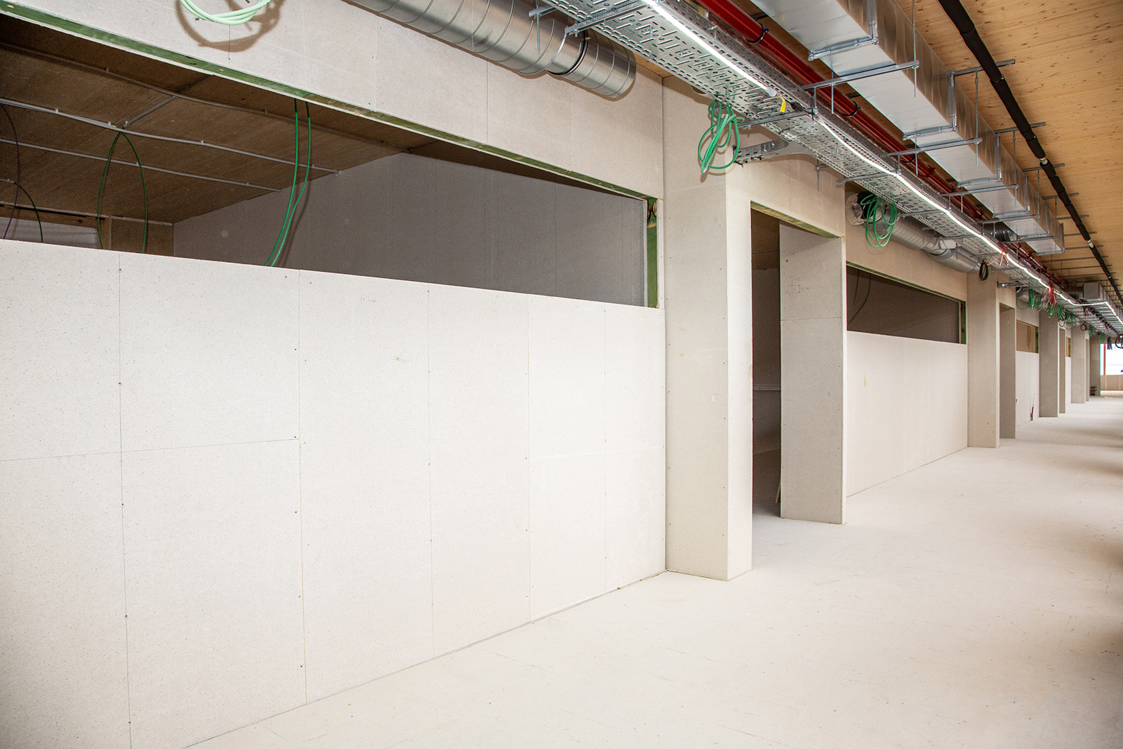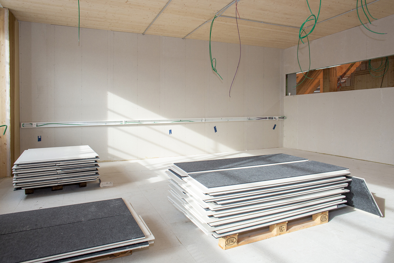 “Voor de vloeren pasten we het fermacell®-vloerelement 2E16 toe, dat een geïntegreerde viltisolatielaag geeft en 29 mm dik is, op een 6 cm dikke laag droge egalisatiekorrels van fermacell™. Het gaat om een oppervlakte van ongeveer 3.000 m². De korrels zorgen niet alleen voor een vlakke ondergrond, maar maken het ook mogelijk om leidingen weg te werken in de vloeropbouw. De egalisatiekorrels kwamen toe in zakken van 25 kg en het was wel een zwaar werk om die naar de juiste plekken in de nieuwbouw te dragen (lacht). Droge dekvloeren gerealiseerd met 2E16 zijn al na 24 uur – wanneer de lijm tussen de overlappende tand- en groefverbinding is uitgehard – beloopbaar, wat de uitvoeringstermijn beperk.”