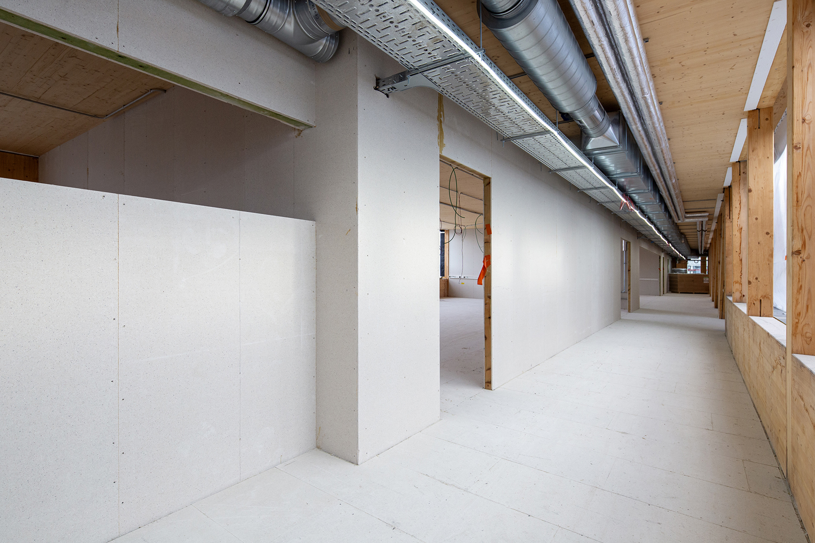 Voor de afbouw van de binnenmuren – ook deze gevormd door gevelcassettes – en droge dekvloeren, kwam ALTER zo uit bij de fermacell®-gipsvezelplaten. Die bestaan volledig uit natuurlijke producten, meer bepaald gerecycleerd papier, gips en water. De platen bevatten dus geen schadelijke stoffen zoals lijm of formaldehyde. Bovendien slaan ze ook CO2 op, meer bepaald in het gebruikte papier, dat CO2 bevat dat de bomen waarvan het gemaakt is uit de lucht hebben gehaald. De platen dragen het Franse ‘Label Produit Biosourcé’, dat het aandeel biogebaseerde grondstoffen in bouwproducten certificeert.
